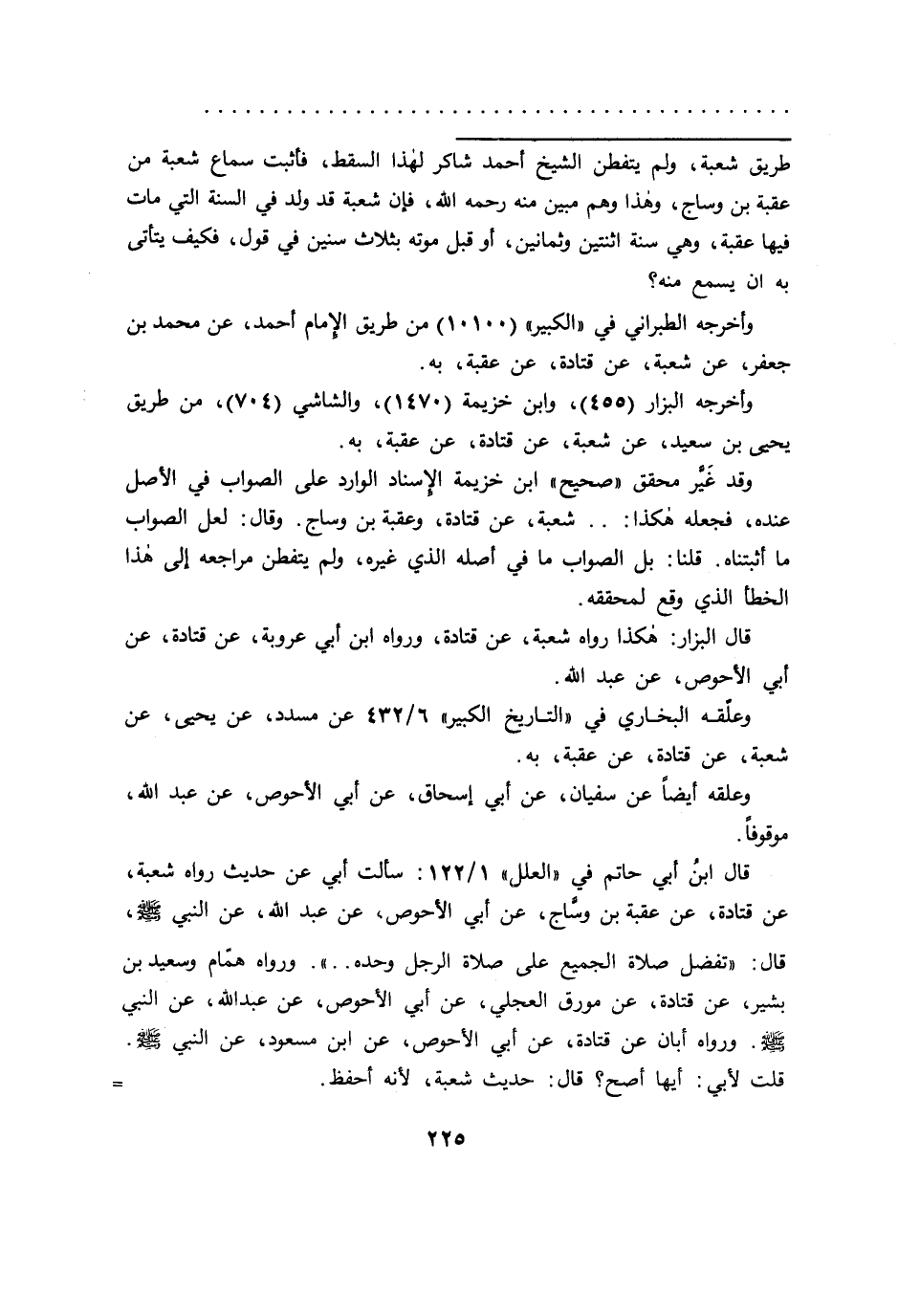 طريق شعبة، ولم يتفطن الشيخ أحمد شاكر لهذا السقط، فأثبت سماع شعبة من عقبة بن وساج، وهذا وهم مبين منه رحمه الله، فإن شعبة قد ولد في السنة التي مات فيها عقبة، وهي سنة إثنتين وثمانين، أو قبل موته بثلاث سنين في قول، فكيف يتأتى به إن يسمع منه؟