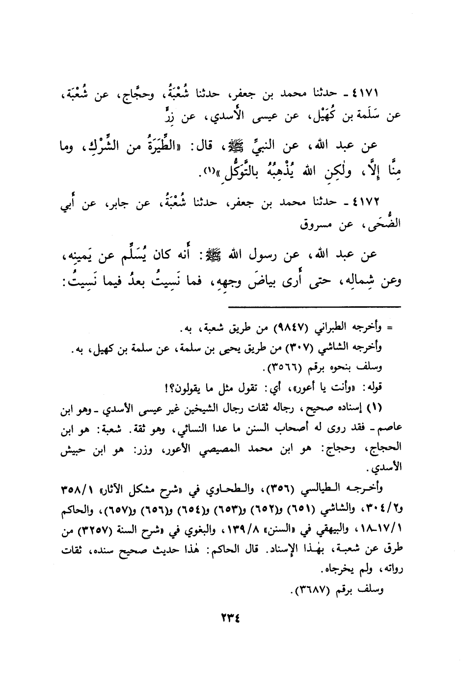 ٤١٧١ - حَدَّثَنَا مُحَمَّدُ بْنُ جَعْفَرٍ، حَدَّثَنَا شُعْبَةُ، وَحَجَّاجٌ، عَنْ شُعْبَةَ، عَنْ سَلَمَةَ بْنِ كُهَيْلٍ، عَنْ عِيسَى الْأَسَدِيِّ، عَنْ زِرٍّ، عَنْ عَبْدِ اللهِ، عَنِ النَّبِيِّ صَلَّى اللهُ عَلَيْهِ وَسَلَّمَ قَالَ: " الطِّيَرَةُ مِنَ الشِّرْكِ، وَمَا مِنَّا إِلَّا، وَلَكِنَّ اللهَ يُذْهِبُهُ بِالتَّوَكُّلِ " (١)
