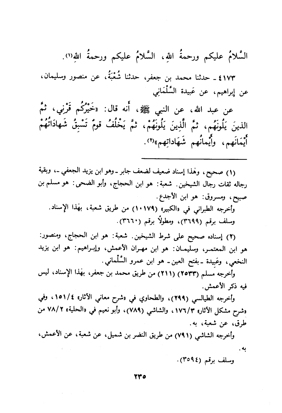٤١٧٣ - حَدَّثَنَا مُحَمَّدُ بْنُ جَعْفَرٍ، حَدَّثَنَا شُعْبَةُ، عَنْ مَنْصُورٍ، وَسُلَيْمَانَ، عَنْ إِبْرَاهِيمَ، عَنْ عَبِيدَةَ السَّلْمَانِيِّ، عَنْ عَبْدِ اللهِ، عَنِ النَّبِيِّ صَلَّى اللهُ عَلَيْهِ وَسَلَّمَ، أَنَّهُ قَالَ: " خَيْرُكُمْ قَرْنِي، ثُمَّ الَّذِينَ يَلُونَهُمْ، ثُمَّ الَّذِينَ يَلُونَهُمْ، ثُمَّ يَخْلُفُ قَوْمٌ تَسْبِقُ شَهَادَاتُهُمْ أَيْمَانَهُمْ، وَأَيْمَانُهُمْ شَهَادَاتِهِمْ " (٢)