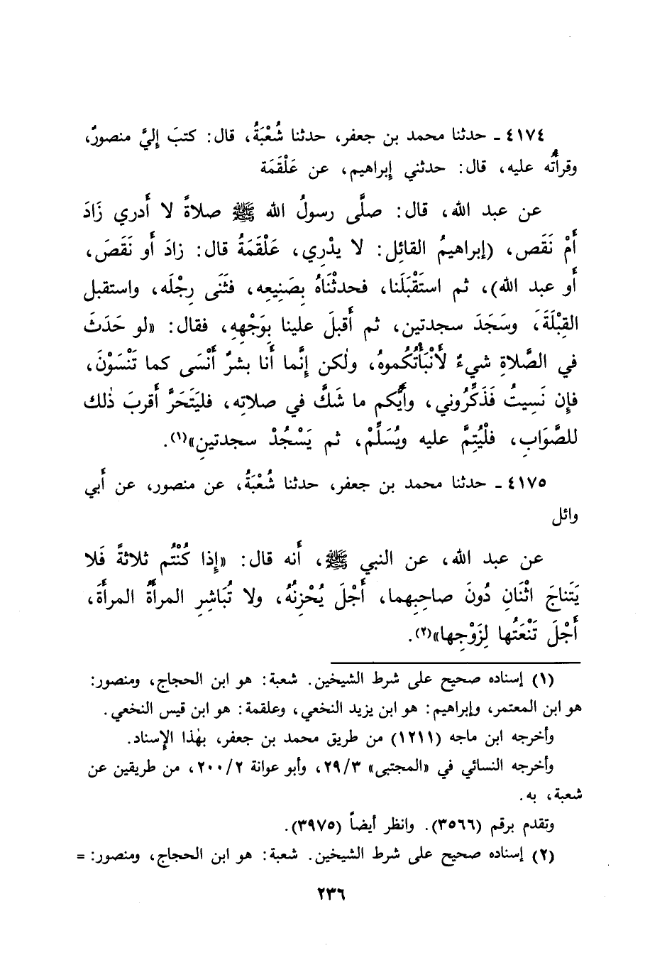 ٤١٧٤ - حَدَّثَنَا مُحَمَّدُ بْنُ جَعْفَرٍ، حَدَّثَنَا شُعْبَةُ، قَالَ: كَتَبَ إِلَيَّ مَنْصُورٌ، وَقَرَأْتُهُ عَلَيْهِ، قَالَ: حَدَّثَنِي إِبْرَاهِيمُ، عَنْ عَلْقَمَةَ، عَنْ عَبْدِ اللهِ، قَالَ: صَلَّى رَسُولُ اللهِ صَلَّى اللهُ عَلَيْهِ وَسَلَّمَ صَلَاةً لَا أَدْرِي زَادَ أَمْ نَقَصَ - إِبْرَاهِيمُ الْقَائِلُ: لَا يَدْرِي، عَلْقَمَةُ قَالَ: زَادَ أَوْ نَقَصَ، أَوْ عَبْدُ اللهِ - ثُمَّ اسْتَقْبَلَنَا، فَحَدَّثْنَاهُ بِصَنِيعِهِ، فَثَنَى رِجْلَهُ، وَاسْتَقْبَلَ الْقِبْلَةَ، وَسَجَدَ سَجْدَتَيْنِ، ثُمَّ أَقْبَلَ عَلَيْنَا بِوَجْهِهِ، فَقَالَ: " لَوْ حَدَثَ فِي الصَّلَاةِ شَيْءٌ لَأَنْبَأْتُكُمُوهُ، وَلَكِنْ إِنَّمَا أَنَا بَشَرٌ أَنْسَى كَمَا تَنْسَوْنَ، فَإِنْ نَسِيتُ فَذَكِّرُونِي، وَأَيُّكُمْ مَا شَكَّ فِي صَلَاتِهِ، فَلْيَتَحَرَّ أَقْرَبَ ذَلِكَ لِلصَّوَابِ، فَلْيُتِمَّ عَلَيْهِ وَيُسَلِّمْ، ثُمَّ يَسْجُدْ سَجْدَتَيْنِ " (١)