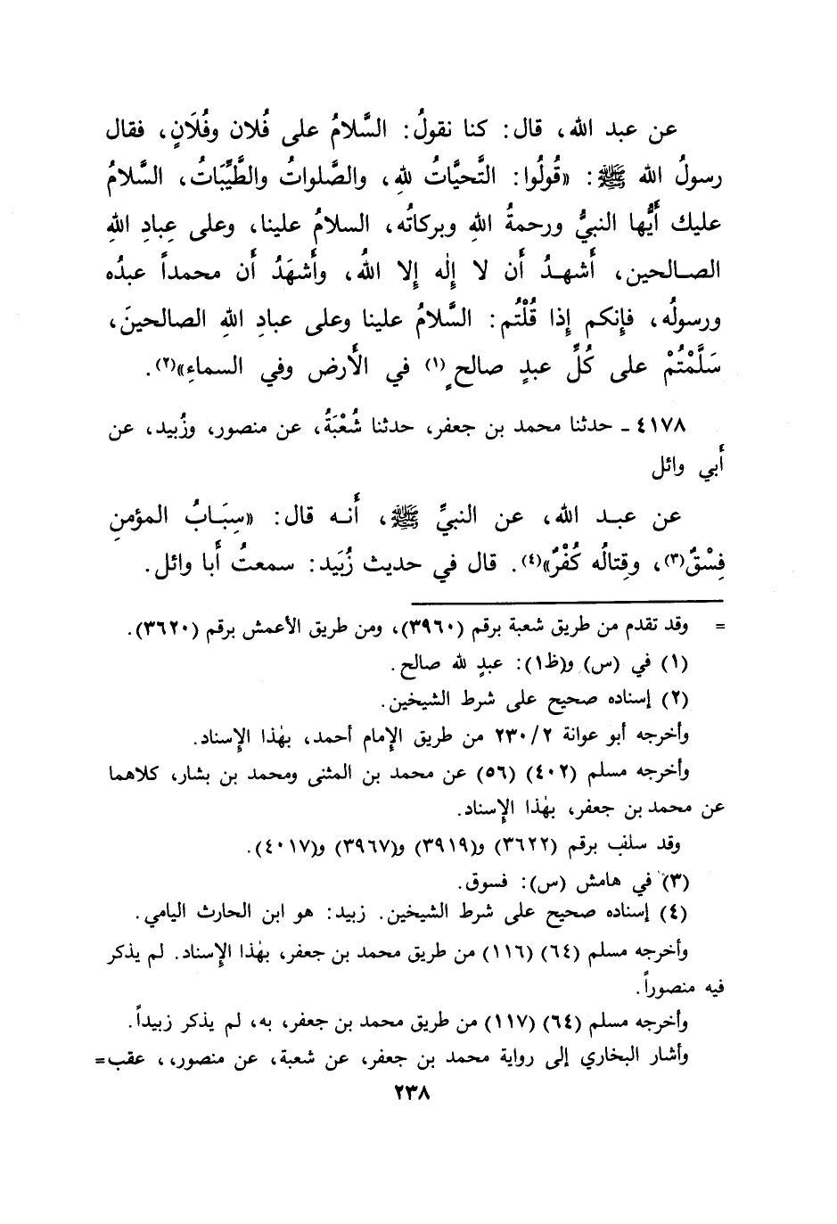 ٤١٧٨ - حَدَّثَنَا مُحَمَّدُ بْنُ جَعْفَرٍ، حَدَّثَنَا شُعْبَةُ، عَنْ مَنْصُورٍ، وَزُبَيْدٌ، عَنْ أَبِي وَائِلٍ، عَنْ عَبْدِ اللهِ، عَنِ النَّبِيِّ صَلَّى اللهُ عَلَيْهِ وَسَلَّمَ أَنَّهُ قَالَ " سِبَابُ الْمُؤْمِنِ فِسْقٌ، (٣) وَقِتَالُهُ كُفْرٌ " (٤) قَالَ فِي حَدِيثِ زُبَيْدٍ سَمِعْتُ أَبَا وَائِلٍ