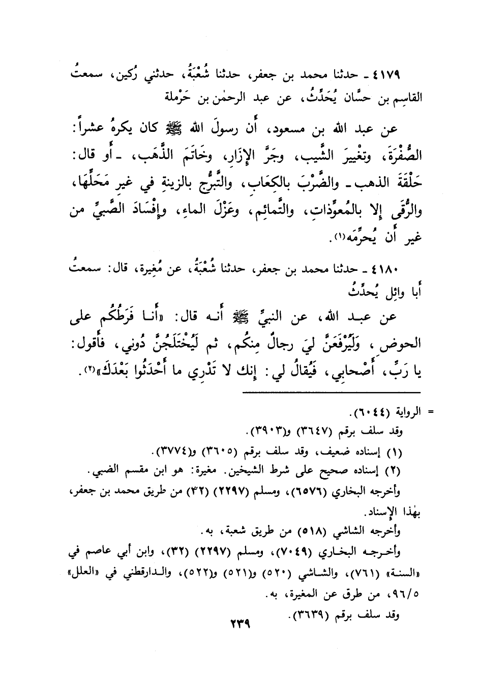٤١٨٠ - حَدَّثَنَا مُحَمَّدُ بْنُ جَعْفَرٍ، حَدَّثَنَا شُعْبَةُ، عَنْ مُغِيرَةَ، قَالَ: سَمِعْتُ أَبَا وَائِلٍ، يُحَدِّثُ، عَنْ عَبْدِ اللهِ، عَنِ النَّبِيِّ صَلَّى اللهُ عَلَيْهِ وَسَلَّمَ، أَنَّهُ قَالَ: " أَنَا فَرَطُكُمْ عَلَى الْحَوْضِ، وَلَيُرْفَعَنَّ لِي رِجَالٌ مِنْكُمْ، ثُمَّ لَيُخْتَلَجُنَّ دُونِي، فَأَقُولُ: يَا رَبِّ، أَصْحَابِي، فَيُقَالُ لِي: إِنَّكَ لَا تَدْرِي مَا أَحْدَثُوا بَعْدَكَ " (٢)