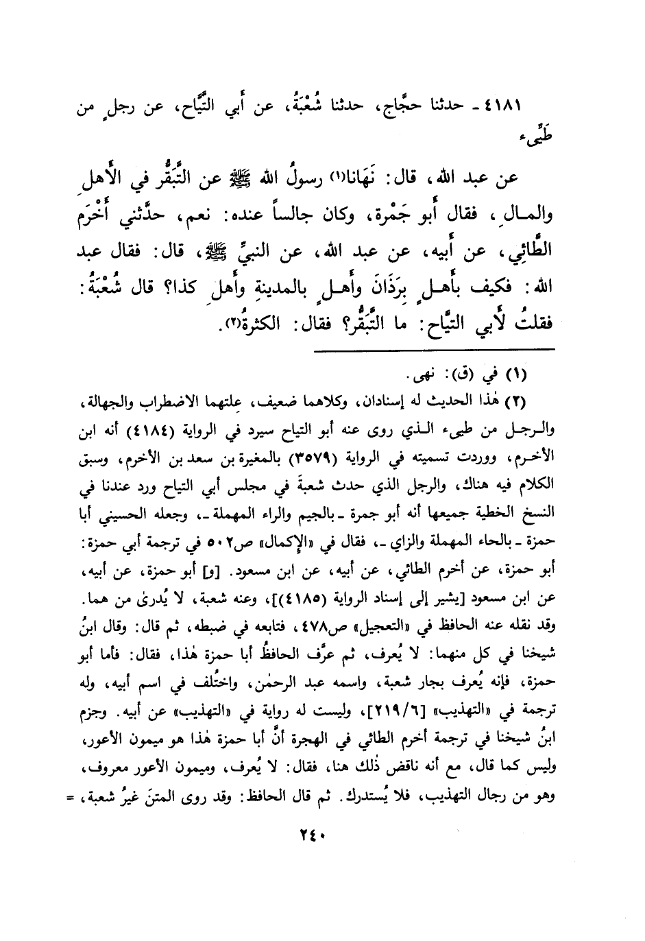 ٤١٨١ - حَدَّثَنَا حَجَّاجٌ، حَدَّثَنَا شُعْبَةُ، عَنْ أَبِي التَّيَّاحِ، عَنْ رَجُلٍ، مِنْ طَيِّئٍ، عَنْ عَبْدِ اللهِ، قَالَ: " نَهَانَا (١) رَسُولُ اللهِ صَلَّى اللهُ عَلَيْهِ وَسَلَّمَ عَنِ التَّبَقُّرِ فِي الْأَهْلِ وَالْمَالِ " فَقَالَ أَبُو حَمْزَةَ: - وَكَانَ جَالِسًا عِنْدَهُ - نَعَمْ، حَدَّثَنِي أَخْرَمُ الطَّائِيُّ، عَنْ أَبِيهِ، عَنْ عَبْدِ اللهِ، عَنِ النَّبِيِّ صَلَّى اللهُ عَلَيْهِ وَسَلَّمَ، قَالَ: فَقَالَ عَبْدُ اللهِ: " فَكَيْفَ بِأَهْلٍ بِرَاذَانَ وَأَهْلٍ بِالْمَدِينَةِ وَأَهْلِ كَذَا؟ " قَالَ شُعْبَةُ: فَقُلْتُ لِأَبِي التَّيَّاحِ: مَا التَّبَقُّرُ؟ فَقَالَ: " الْكَثْرَةُ " (٢)