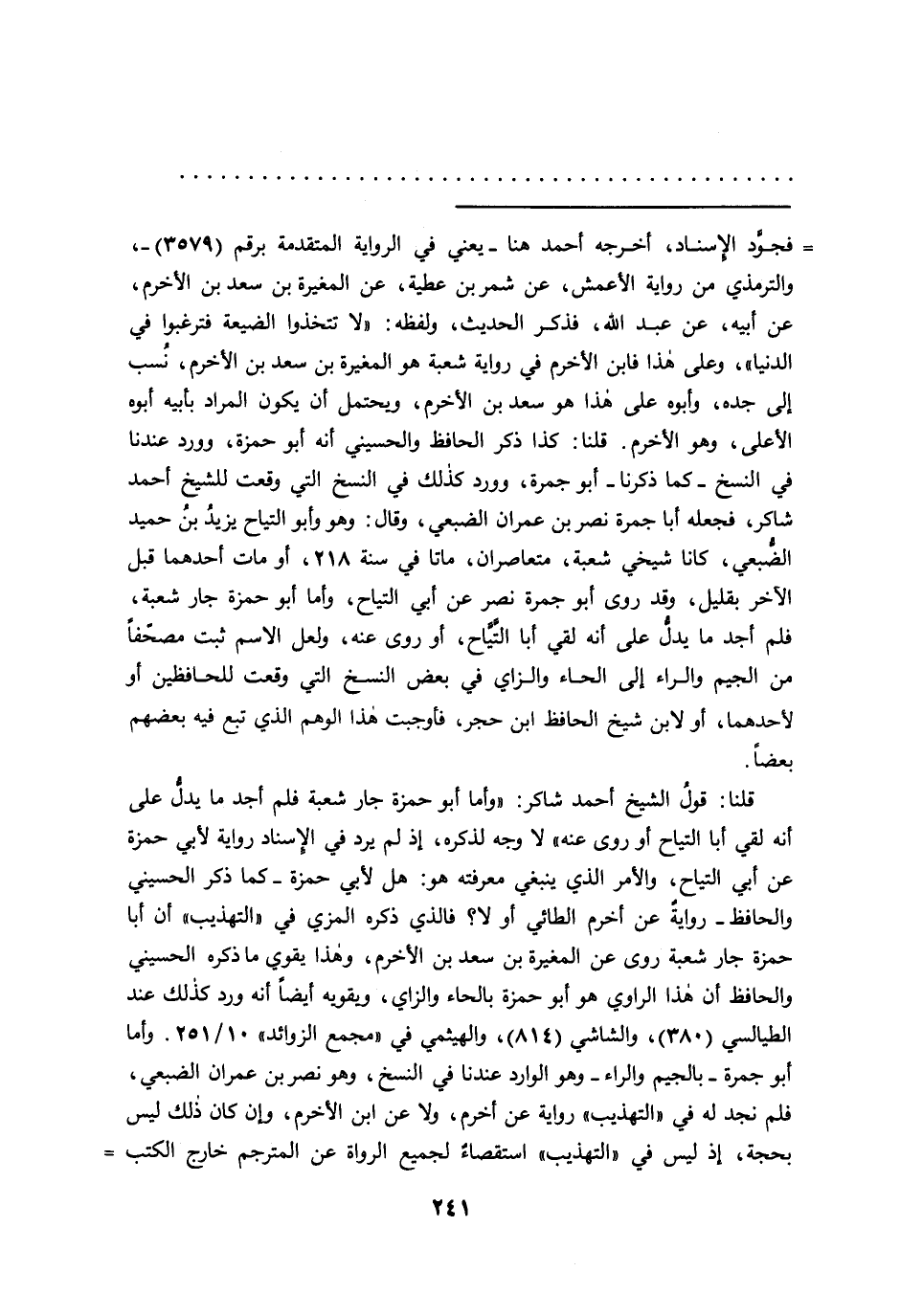 قلنا: قولُ الشيخ أحمد شاكر: "وأما أبو حمزة جار شعبة فلم أجد ما يدلْ على أنه لقي أبا التياح أو روى عنه " لا وجه لذكره، إذ لم يرد في الإسناد رواية لأبي حمزة عن أبي التياح، والأمر الذي ينبغي معرفته هو: هل لأبي حمزة - كما ذكر الحسيني والحافظ - رواية عن أخرم الطائي أو لا؟ الذي ذكره المزي في "التهذيب " أن أبا حمزة جار شعبة روى عن المغيرة بن سعد بن الأخرم، وهذا يقوي ما ذكره الحسيني والحافظ أن هذا الراوي هو أبو حمزة بالحاء والزاي، ويقويه أيضاً أنه ورد كذلك عند الطيالسي (٣٨٠) ، والشاشي (٨١٤) ، والهيثمي في "مجمع الزوائد" ١٠/٢٥١. وأما