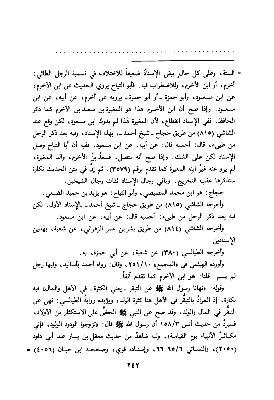= الستة، وعلى كل حال يبقى الإِسنادُ ضعيفاً للاختلاف في تسمية الرجل الطائي: أخرم، أو ابن الأخرم، وللاضطراب فيه. فأبو التياح يروي الحديث عن ابن الأخرم، عن ابن مسعود، وأبو حمزة - أو أبو جمرة - يرويه عن أخرم، عن أبيه، عن ابن مسعود. وإذا صح أن ابن الأخرم هذا هو المغيرة بن سعد بن الأخرم كما ذكر الحافظ، ففي الإسناد انقطاع، لأن المغيرة هذا لم يدرك ابن مسعود، لكن وقع عند الشاشي (٨١٥) من طريق حجاج - شيخ أحمد -، بهذا الإسناد، وفيه بعد ذكر الرجل من طيىء، قال: أحسبه قال: عن أبيه، عن ابن مسعود، ففيه أن أبا التياح وصل الإسناد لكن على الشك. وإذا صح أنه متصل، فسعدُ بنُ الأخرم، والد المغيرة، لم يرو عنه غيرُ ابنِه المغيرة كما تقدم برقم (٣٥٧٩) . ثم إن في متن الحديث نكارة سنذكرها عقب التخريج. وباقي رجال الإسناد ثقات رجال الشيخين.