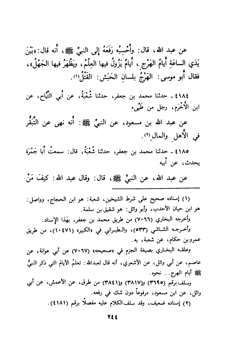 وعلقه البخاري بصيغة الجزم في "صحيحه " (٧٠٦٧) عن أبي عوانة، عن عاصم، عن أبي وائل، عن الأشعري، أنه قال لعبد الله: تعلمُ الأيامَ التي ذكر النبى صَلَّى اللهُ عَلَيْهِ وَسَلَّمَ أيام الهرج.. نحوه.