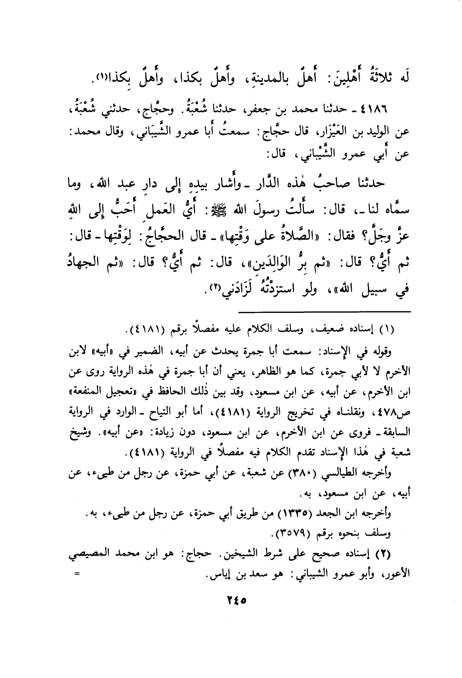٤١٨٦ - حَدَّثَنَا مُحَمَّدُ بْنُ جَعْفَرٍ، حَدَّثَنَا شُعْبَةُ، وَحَجَّاجٌ، حَدَّثَنِي شُعْبَةُ، عَنِ الْوَلِيدِ بْنِ الْعَيْزَارِ، قَالَ حَجَّاجٌ: سَمِعْتُ أَبَا عَمْرٍو الشَّيْبَانِيَّ، وَقَالَ مُحَمَّدٌ: عَنْ أَبِي عَمْرٍو الشَّيْبَانِيِّ، قَالَ: حَدَّثَنَا صَاحِبُ هَذِهِ الدَّارِ وَأَشَارَ بِيَدِهِ إِلَى دَارِ عَبْدِ اللهِ، - وَمَا سَمَّاهُ لَنَا - قَالَ: سَأَلْتُ رَسُولَ اللهِ صَلَّى اللهُ عَلَيْهِ وَسَلَّمَ: أَيُّ الْعَمَلِ أَحَبُّ إِلَى اللهِ عَزَّ وَجَلَّ؟، فَقَالَ: " الصَّلَاةُ عَلَى وَقْتِهَا "، - قَالَ الْحَجَّاجُ: لِوَقْتِهَا -، قَالَ: ثُمَّ أَيٌّ؟، قَالَ: " ثُمَّ بِرُّ الْوَالِدَيْنِ "، قَالَ: ثُمَّ أَيٌّ؟ قَالَ: " ثُمَّ الْجِهَادُ فِي سَبِيلِ اللهِ " وَلَوِ اسْتَزَدْتُهُ لَزَادَنِي (٢)