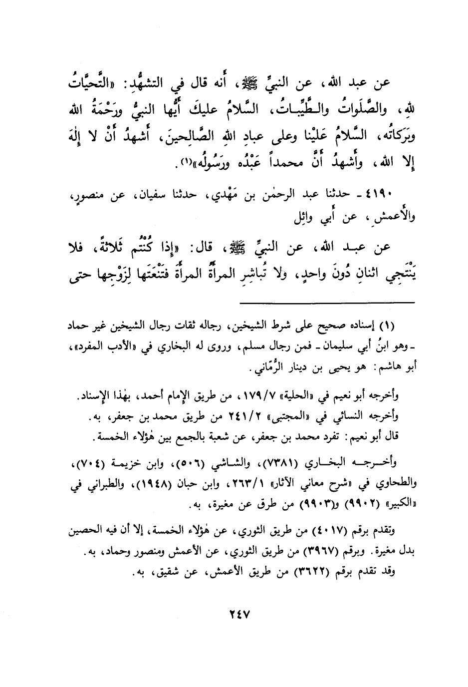 ٤١٩٠ - حَدَّثَنَا عَبْدُ الرَّحْمَنِ بْنُ مَهْدِيٍّ، حَدَّثَنَا سُفْيَانُ، عَنْ مَنْصُورٍ، وَالْأَعْمَشِ، عَنْ أَبِي وَائِلٍ، عَنْ عَبْدِ اللهِ، عَنِ النَّبِيِّ صَلَّى اللهُ عَلَيْهِ وَسَلَّمَ قَالَ: " إِذَا كُنْتُمْ ثَلَاثَةً، فَلَا يَنْتَجِي اثْنَانِ دُونَ وَاحِدٍ، وَلَا تُبَاشِرُ الْمَرْأَةُ الْمَرْأَةَ فَتَنْعَتَهَا لِزَوْجِهَا حَتَّى