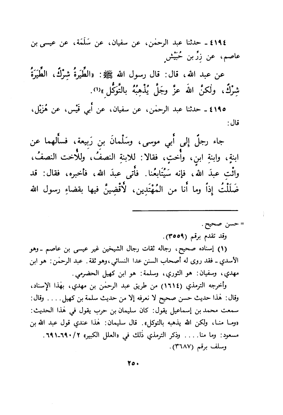 ٤١٩٤ - حَدَّثَنَا عَبْدُ الرَّحْمَنِ، عَنْ سُفْيَانَ، عَنْ سَلَمَةَ، عَنْ عِيسَى بْنِ عَاصِمٍ، عَنْ زِرِّ بْنِ حُبَيْشٍ، عَنْ عَبْدِ اللهِ، قَالَ: قَالَ رَسُولُ اللهِ صَلَّى اللهُ عَلَيْهِ وَسَلَّمَ: " الطِّيَرَةُ شِرْكٌ، الطِّيَرَةُ شِرْكٌ، وَلَكِنَّ اللهَ عَزَّ وَجَلَّ يُذْهِبُهُ بِالتَّوَكُّلِ " (١)