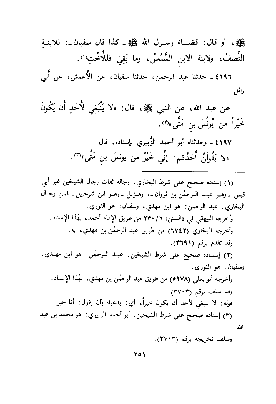 ٤١٩٦ - حَدَّثَنَا عَبْدُ الرَّحْمَنِ، حَدَّثَنَا سُفْيَانُ، عَنْ الْأَعْمَشِ، عَنْ أَبِي وَائِلٍ، عَنْ عَبْدِ اللهِ، عَنِ النَّبِيِّ صَلَّى اللهُ عَلَيْهِ وَسَلَّمَ قَالَ: " لَا يَنْبَغِي لِأَحَدٍ أَنْ يَكُونَ خَيْرًا مِنْ يُونُسَ بْنِ مَتَّى " (٢)