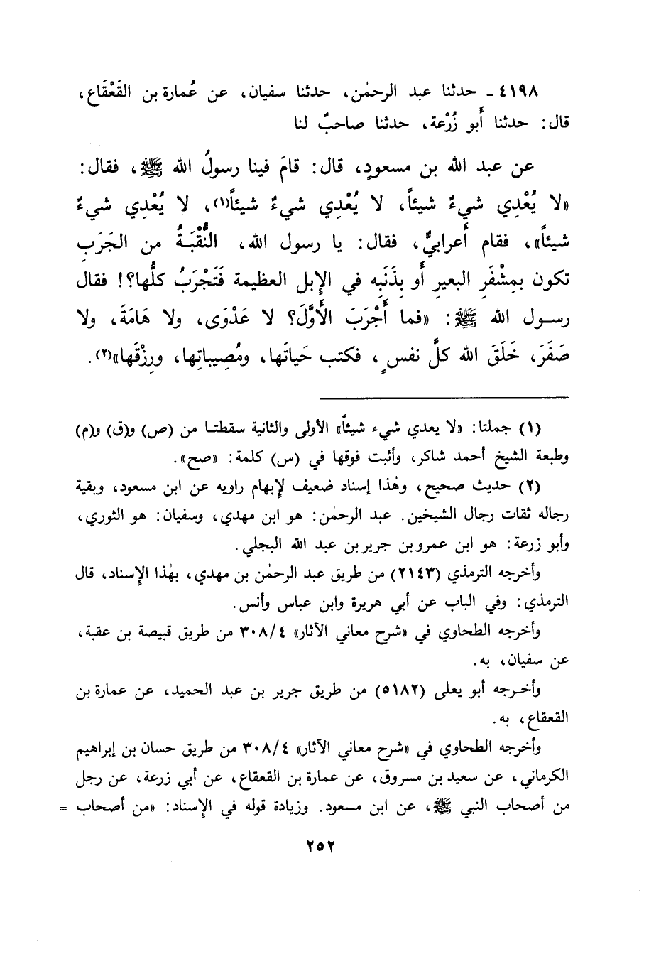٤١٩٨ - حَدَّثَنَا عَبْدُ الرَّحْمَنِ، حَدَّثَنَا سُفْيَانُ، عَنْ عُمَارَةَ بْنِ الْقَعْقَاعِ، قَالَ: حَدَّثَنَا أَبُو زُرْعَةَ، حَدَّثَنَا صَاحِبٌ لَنَا، عَنْ عَبْدِ اللهِ بْنِ مَسْعُودٍ، قَالَ: قَامَ فِينَا رَسُولُ اللهِ صَلَّى اللهُ عَلَيْهِ وَسَلَّمَ فَقَالَ: " لَا يُعْدِي شَيْءٌ شَيْئًا (١) "، لَا يُعْدِي شَيْءٌ شَيْئًا، لَا يُعْدِي شَيْءٌ شَيْئًا "، فَقَامَ أَعْرَابِيٌّ، فَقَالَ: يَا رَسُولَ اللهِ، النُّقْبَةُ مِنَ الْجَرَبِ تَكُونُ بِمِشْفَرِ الْبَعِيرِ أَوْ بِذَنَبِهِ فِي الْإِبِلِ الْعَظِيمَةِ فَتَجْرَبُ كُلُّهَا؟ فَقَالَ رَسُولُ اللهِ صَلَّى اللهُ عَلَيْهِ وَسَلَّمَ: " فَمَا أَجْرَبَ الْأَوَّلَ؟ لَا عَدْوَى، وَلَا هَامَةَ، وَلَا صَفَرَ، خَلَقَ اللهُ كُلَّ نَفْسٍ، فَكَتَبَ حَيَاتَهَا، وَمُصِيبَاتِهَا، وَرِزْقَهَا " (٢)