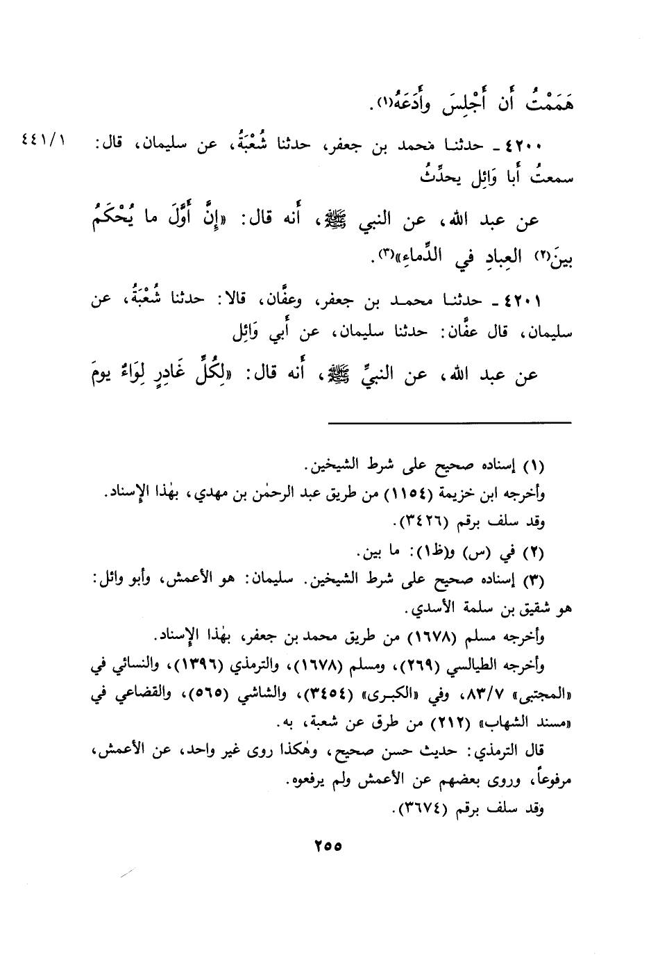 ٤٢٠٠ - حَدَّثَنَا مُحَمَّدُ بْنُ جَعْفَرٍ، حَدَّثَنَا شُعْبَةُ، عَنْ سُلَيْمَانَ، قَالَ: سَمِعْتُ أَبَا وَائِلٍ، يُحَدِّثُ، عَنْ عَبْدِ اللهِ، عَنِ النَّبِيِّ صَلَّى اللهُ عَلَيْهِ وَسَلَّمَ، أَنَّهُ قَالَ: " إِنَّ أَوَّلَ مَا يُحْكَمُ بَيْنَ (٢) الْعِبَادِ فِي الدِّمَاءِ " (٣)