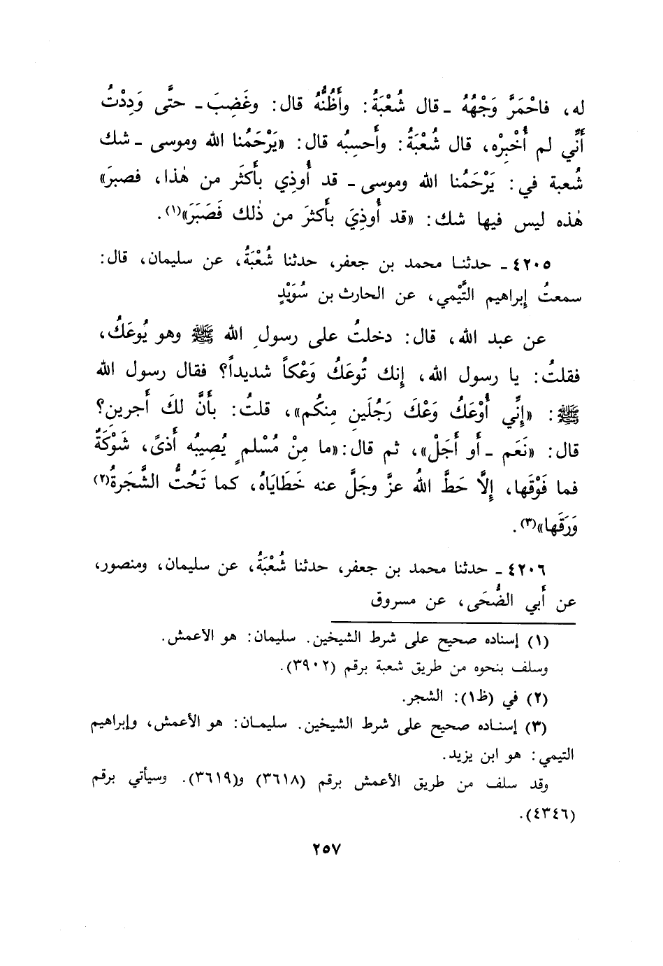 ٤٢٠٥ - حَدَّثَنَا مُحَمَّدُ بْنُ جَعْفَرٍ، حَدَّثَنَا شُعْبَةُ، عَنْ سُلَيْمَانَ، قَالَ: سَمِعْتُ إِبْرَاهِيمَ التَّيْمِيَّ، عَنِ الْحَارِثِ بْنِ سُوَيْدٍ، عَنْ عَبْدِ اللهِ، قَالَ: دَخَلْتُ عَلَى رَسُولِ اللهِ صَلَّى اللهُ عَلَيْهِ وَسَلَّمَ وَهُوَ يُوعَكُ، فَقُلْتُ: يَا رَسُولَ اللهِ، إِنَّكَ تُوعَكُ وَعْكًا شَدِيدًا؟ فَقَالَ رَسُولُ اللهِ صَلَّى اللهُ عَلَيْهِ وَسَلَّمَ: " إِنِّي أُوعَكُ وَعْكَ رَجُلَيْنِ مِنْكُمْ "، قُلْتُ: بِأَنَّ لَكَ أَجْرَيْنِ؟ قَالَ: " نَعَمْ - أَوْ أَجَلْ - "، ثُمَّ قَالَ: " مَا مِنْ مُسْلِمٍ يُصِيبُهُ أَذًى، شَوْكَةٌ فَمَا فَوْقَهَا، إِلَّا حَطَّ اللهُ عَزَّ وَجَلَّ عَنْهُ خَطَايَاهُ، كَمَا تَحُتُّ الشَّجَرَةُ (٢) وَرَقَهَا " (٣)