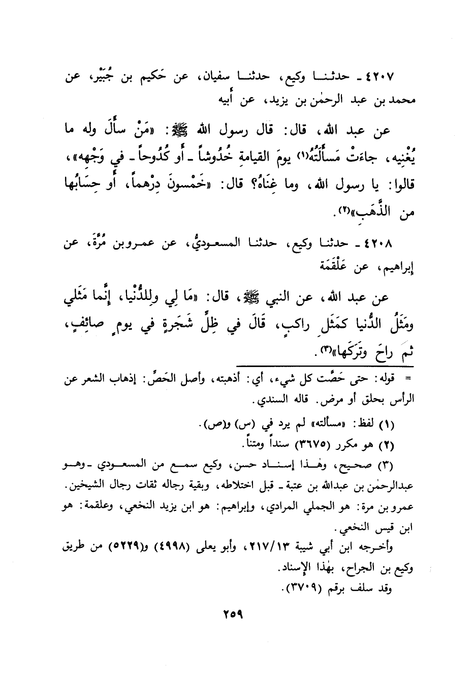 ٤٢٠٧ - حَدَّثَنَا وَكِيعٌ، حَدَّثَنَا سُفْيَانُ، عَنْ حَكِيمِ بْنِ جُبَيْرٍ، عَنْ مُحَمَّدِ بْنِ عَبْدِ الرَّحْمَنِ بْنِ يَزِيدَ، عَنْ أَبِيهِ، عَنْ عَبْدِ اللهِ، قَالَ: قَالَ رَسُولُ اللهِ صَلَّى اللهُ عَلَيْهِ وَسَلَّمَ: " مَنْ سَأَلَ وَلَهُ مَا يُغْنِيهِ، جَاءَتْ مَسْأَلَتُهُ (١) يَوْمَ الْقِيَامَةِ خُدُوشًا - أَوْ كُدُوحًا - فِي وَجْهِهِ "، قَالُوا: يَا رَسُولَ اللهِ، وَمَا غِنَاهُ؟ قَالَ: " خَمْسُونَ دِرْهَمًا، أَوْ حِسَابُهَا مِنَ الذَّهَبِ " (٢)