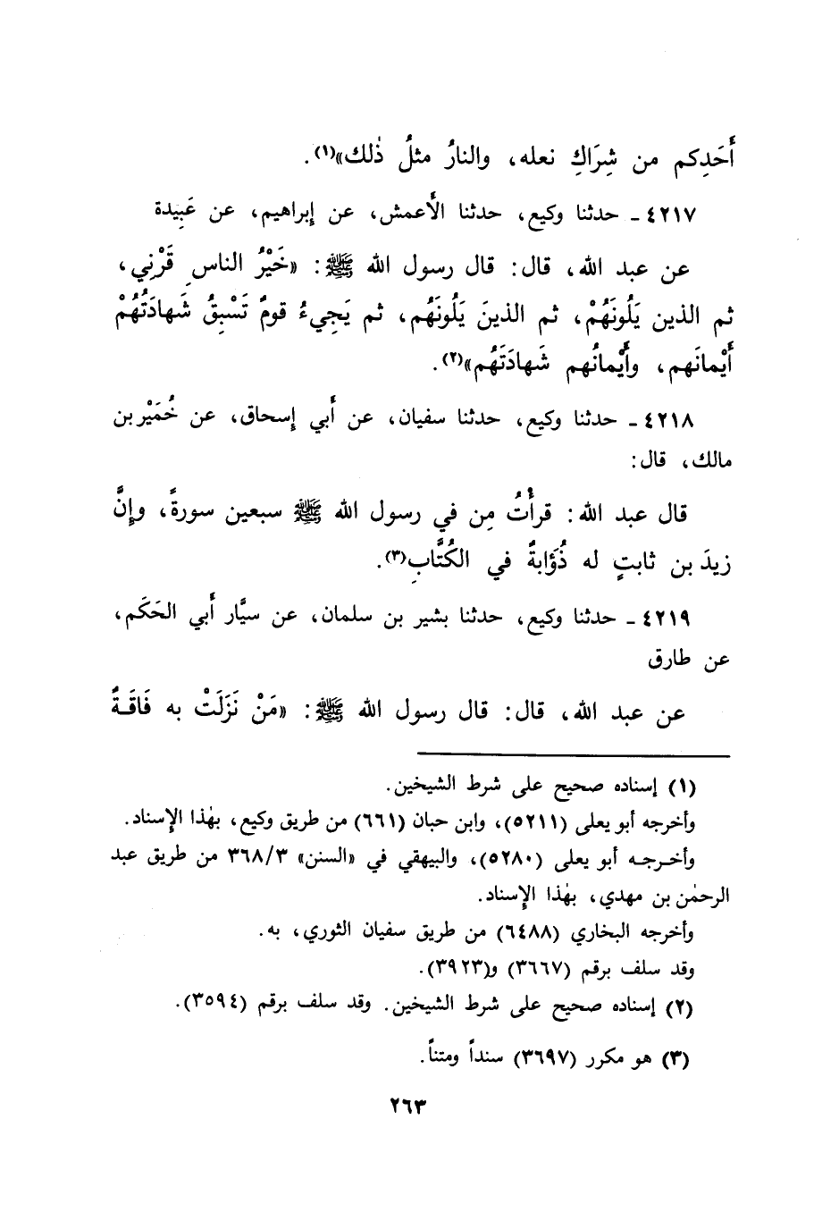 ٤٢١٧ - حَدَّثَنَا وَكِيعٌ، حَدَّثَنَا الْأَعْمَشُ، عَنْ إِبْرَاهِيمَ، عَنْ عَبِيدَةَ، عَنْ عَبْدِ اللهِ، قَالَ: قَالَ رَسُولُ اللهِ صَلَّى اللهُ عَلَيْهِ وَسَلَّمَ: " خَيْرُ النَّاسِ قَرْنِي، ثُمَّ الَّذِينَ يَلُونَهُمْ، ثُمَّ الَّذِينَ يَلُونَهُمْ، ثُمَّ يَجِيءُ قَوْمٌ تَسْبِقُ شَهَادَتُهُمْ أَيْمَانَهُمْ، وَأَيْمَانُهُمْ شَهَادَتَهُمْ " (٢)
