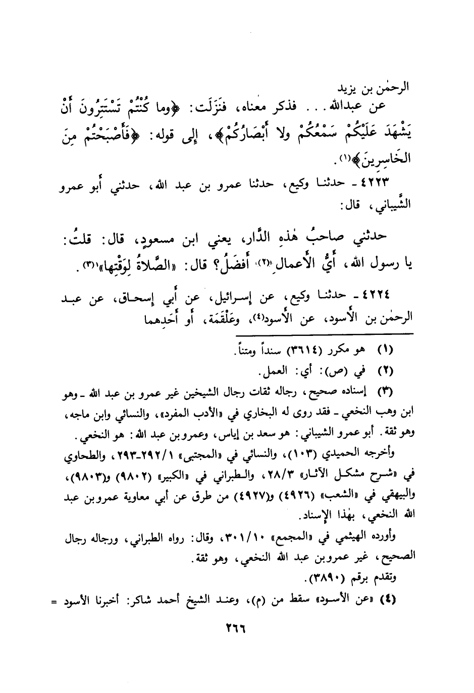 ٤٢٢٣ - حَدَّثَنَا وَكِيعٌ، حَدَّثَنَا عَمْرُو بْنُ عَبْدِ اللهِ، حَدَّثَنِي أَبُو عَمْرٍو الشَّيْبَانِيُّ، قَالَ: حَدَّثَنِي صَاحِبُ هَذِهِ الدَّارِ - يَعْنِي ابْنَ مَسْعُودٍ - قَالَ: قُلْتُ يَا رَسُولَ اللهِ: أَيُّ الْأَعْمَالِ (٢) أَفْضَلُ؟ قَالَ: " الصَّلَاةُ لِوَقْتِهَا " (٣)