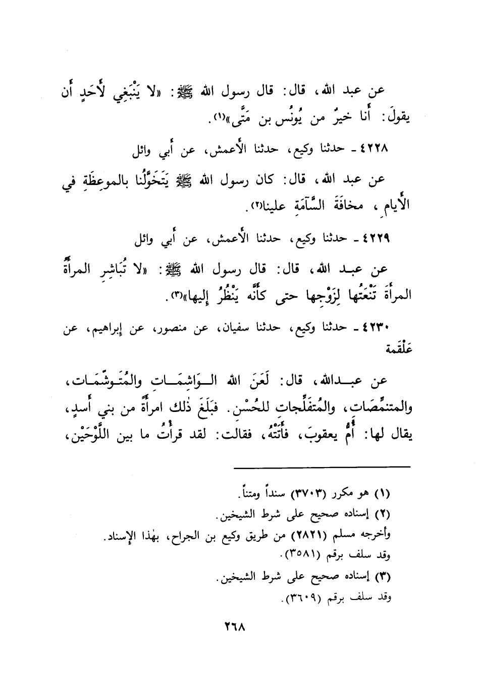 ٤٢٢٩ - حَدَّثَنَا وَكِيعٌ، حَدَّثَنَا الْأَعْمَشُ، عَنْ أَبِي وَائِلٍ، عَنْ عَبْدِ اللهِ، قَالَ: قَالَ رَسُولُ اللهِ صَلَّى اللهُ عَلَيْهِ وَسَلَّمَ: " لَا تُبَاشِرُ الْمَرْأَةُ الْمَرْأَةَ تَنْعَتُهَا لِزَوْجِهَا حَتَّى كَأَنَّهُ يَنْظُرُ إِلَيْهَا " (٣)