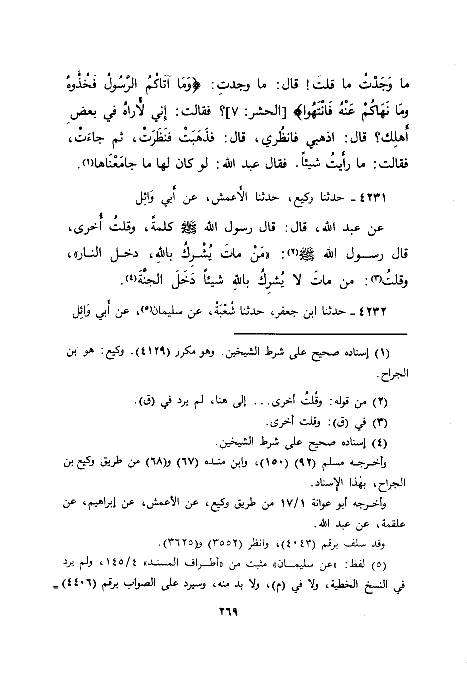 ٤٢٣٢ - حَدَّثَنَا ابْنُ جَعْفَرٍ، حَدَّثَنَا شُعْبَةُ، عَنْ سُلَيْمَانَ (٥) ، عَنْ أَبِي وَائِلٍ،