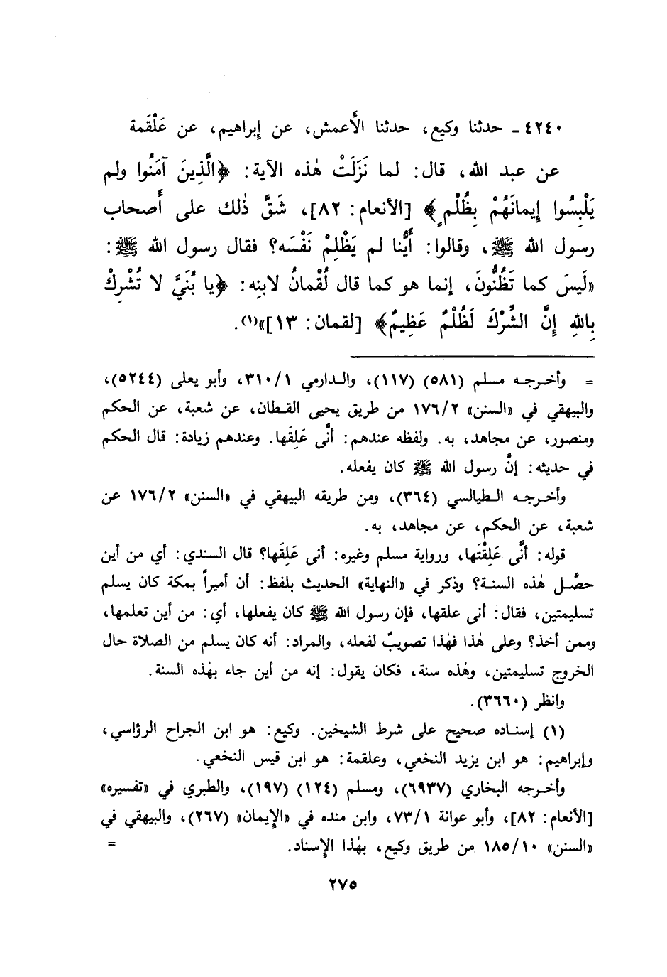 ٤٢٤٠ - حَدَّثَنَا وَكِيعٌ، حَدَّثَنَا الْأَعْمَشُ، عَنْ إِبْرَاهِيمَ، عَنْ عَلْقَمَةَ، عَنْ عَبْدِ اللهِ، قَالَ: لَمَّا نَزَلَتْ هَذِهِ الْآيَةُ: {الَّذِينَ آمَنُوا وَلَمْ يَلْبِسُوا} [الأنعام: ٨٢] إِيمَانَهُمْ بِظُلْمٍ شَقَّ ذَلِكَ عَلَى أَصْحَابِ رَسُولِ اللهِ صَلَّى اللهُ عَلَيْهِ وَسَلَّمَ، وَقَالُوا: أَيُّنَا لَمْ يَظْلِمْ نَفْسَهُ؟ فَقَالَ رَسُولُ اللهِ صَلَّى اللهُ عَلَيْهِ وَسَلَّمَ: " لَيْسَ كَمَا تَظُنُّونَ، إِنَّمَا هُوَ كَمَا قَالَ لُقْمَانُ لِابْنِهِ ": {يَا بُنَيَّ لَا تُشْرِكْ بِاللهِ، إِنَّ الشِّرْكَ لَظُلْمٌ عَظِيمٌ} [لقمان: ١٣] (١)
