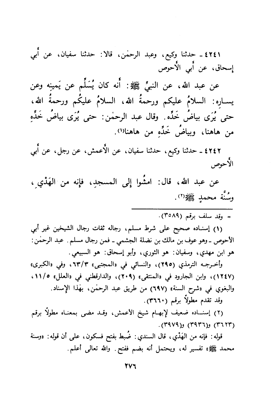 ٤٢٤١ - حَدَّثَنَا وَكِيعٌ، وَعَبْدُ الرَّحْمَنِ، قَالَا: حَدَّثَنَا سُفْيَانُ، عَنْ أَبِي إِسْحَاقَ، عَنْ أَبِي الْأَحْوَصِ، عَنْ عَبْدِ اللهِ، عَنِ النَّبِيِّ صَلَّى اللهُ عَلَيْهِ وَسَلَّمَ أَنَّهُ: " كَانَ يُسَلِّمُ عَنْ يَمِينِهِ، وَعَنْ يَسَارِهِ السَّلَامُ عَلَيْكُمْ وَرَحْمَةُ اللهِ، السَّلَامُ عَلَيْكُمْ وَرَحْمَةُ اللهِ، حَتَّى يُرَى بَيَاضُ خَدِّهِ " وَقَالَ عَبْدُ الرَّحْمَنِ: " حَتَّى يُرَى بَيَاضُ خَدِّهِ مِنْ هَاهُنَا، وَيُرَى بَيَاضُ خَدِّهِ مِنْ هَاهُنَا " (١)
