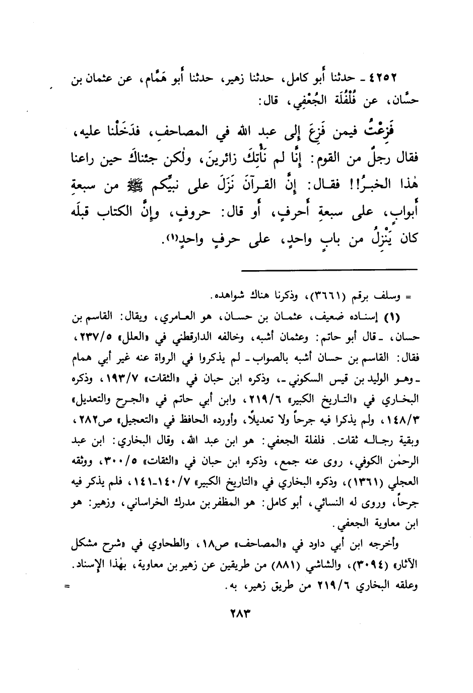 ٤٢٥٢ - حَدَّثَنَا أَبُو كَامِلٍ، حَدَّثَنَا زُهَيْرٌ، حَدَّثَنَا أَبُو هَمَّامٍ، عَنْ عُثْمَانَ بْنِ حَسَّانَ، عَنْ فُلْفُلَةَ الْجُعْفِيِّ، قَالَ: فَزِعْتُ فِيمَنْ فَزِعَ إِلَى عَبْدِ اللهِ فِي الْمَصَاحِفِ، فَدَخَلْنَا عَلَيْهِ، فَقَالَ رَجُلٌ مِنَ الْقَوْمِ: إِنَّا لَمْ نَأْتِكَ زَائِرِينَ، وَلَكِنْ جِئْنَاكَ حِينَ رَاعَنَا هَذَا الْخَبَرُ فَقَالَ: " إِنَّ الْقُرْآنَ نَزَلَ عَلَى نَبِيِّكُمْ صَلَّى اللهُ عَلَيْهِ وَسَلَّمَ، مِنْ سَبْعَةِ أَبْوَابٍ، عَلَى سَبْعَةِ أَحْرُفٍ "، أَوْ قَالَ: " حُرُوفٍ، وَإِنَّ الْكِتَابَ قَبْلَهُ كَانَ يَنْزِلُ مِنْ بَابٍ وَاحِدٍ، عَلَى حَرْفٍ وَاحِدٍ " (١)