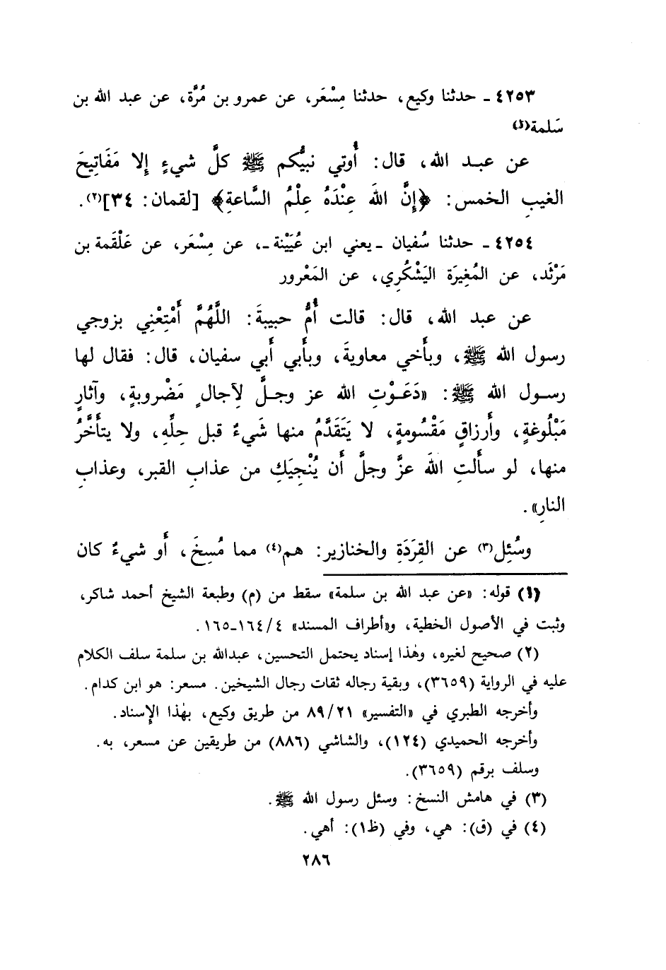 ٤٢٥٤ - حَدَّثَنَا سُفْيَانُ يَعْنِي ابْنَ عُيَيْنَةَ، عَنْ مِسْعَرٍ، عَنْ عَلْقَمَةَ بْنِ مَرْثَدٍ، عَنْ مُغِيرَةَ الْيَشْكُرِيِّ، عَنْ الْمَعْرُورِ، عَنْ عَبْدِ اللهِ، قَالَ: قَالَتْ أُمُّ حَبِيبَةَ: اللهُمَّ أَمْتِعْنِي بِزَوْجِي رَسُولِ اللهِ صَلَّى اللهُ عَلَيْهِ وَسَلَّمَ، وَبِأَخِي مُعَاوِيَةَ، وَبِأَبِي أَبِي سُفْيَانَ، قَالَ: فَقَالَ لَهَا رَسُولُ اللهِ صَلَّى اللهُ عَلَيْهِ وَسَلَّمَ: " دَعَوْتِ اللهَ عَزَّ وَجَلَّ لِآجَالٍ مَضْرُوبَةٍ، وَآثَارٍ مَبْلُوغَةٍ، وَأَرْزَاقٍ مَقْسُومَةٍ، لَا يَتَقَدَّمُ مِنْهَا شَيْءٌ قَبْلَ حِلِّهِ، وَلَا يَتَأَخَّرُ مِنْهَا، لَوْ سَأَلْتِ اللهَ عَزَّ وَجَلَّ أَنْ يُنْجِيَكِ مِنْ عَذَابِ الْقَبْرِ، وَعَذَابِ النَّارِ "