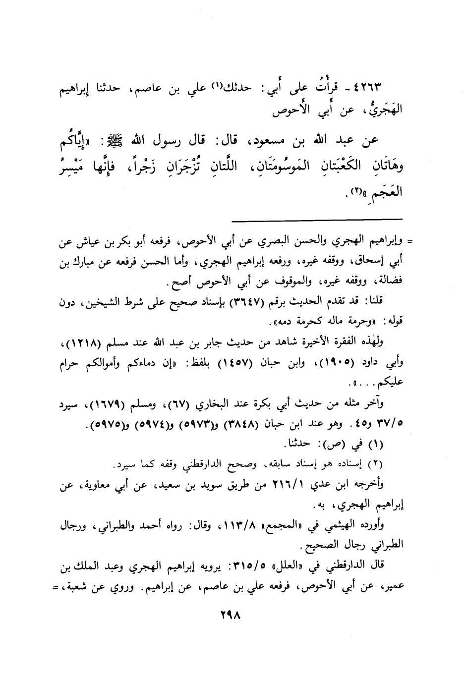 ٤٢٦٣ - قَرَأْتُ عَلَى أَبِي، حَدَّثَكَ (١) عَلِيُّ بْنُ عَاصِمٍ، حَدَّثَنَا إِبْرَاهِيمُ الْهَجَرِيُّ، عَنْ أَبِي الْأَحْوَصِ، عَنْ عَبْدِ اللهِ بْنِ مَسْعُودٍ، قَالَ: قَالَ رَسُولُ اللهِ صَلَّى اللهُ عَلَيْهِ وَسَلَّمَ: " إِيَّاكُمْ وَهَاتَانِ الْكَعْبَتَانِ الْمَوْسُومَتَانِ اللَّتَانِ تُزْجَرَانِ زَجْرًا، فَإِنَّهُمَا مَيْسِرُ الْعَجَمِ " (٢)