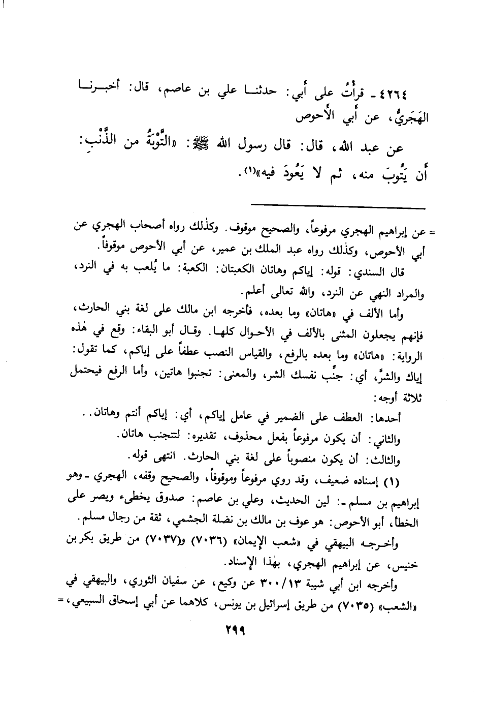٤٢٦٤ - قَرَأْتُ عَلَى أَبِي، حَدَّثَنَا عَلِيُّ بْنُ عَاصِمٍ قَالَ: أَخْبَرَنَا الْهَجَرِيُّ، عَنْ أَبِي الْأَحْوَصِ، عَنْ عَبْدِ اللهِ، قَالَ: قَالَ رَسُولُ اللهِ صَلَّى اللهُ عَلَيْهِ وَسَلَّمَ: " التَّوْبَةُ مِنَ الذَّنْبِ: أَنْ يَتُوبَ مِنْهُ، ثُمَّ لَا يَعُودَ فِيهِ " (١)