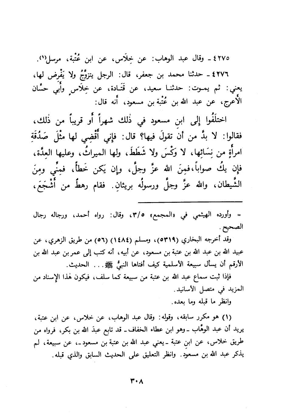 (١) هو مكرر سابقه، وقوله: وقال عبد الوهاب، عن خلاس، عن ابن عتبة، يريد أن عبد الوهاب - وهو ابن عطاء الخفاف - قد تابع عبدَ الله بن بكر، فرواه من طريق خلاس، عن ابنِ عتبة - يعني عبد الله بن عتبة بن مسعود -، عن سبيعة، لم يذكر عبد الله بن مسعود. وانظر التعليق على الحديث السابق والذي قبله.
