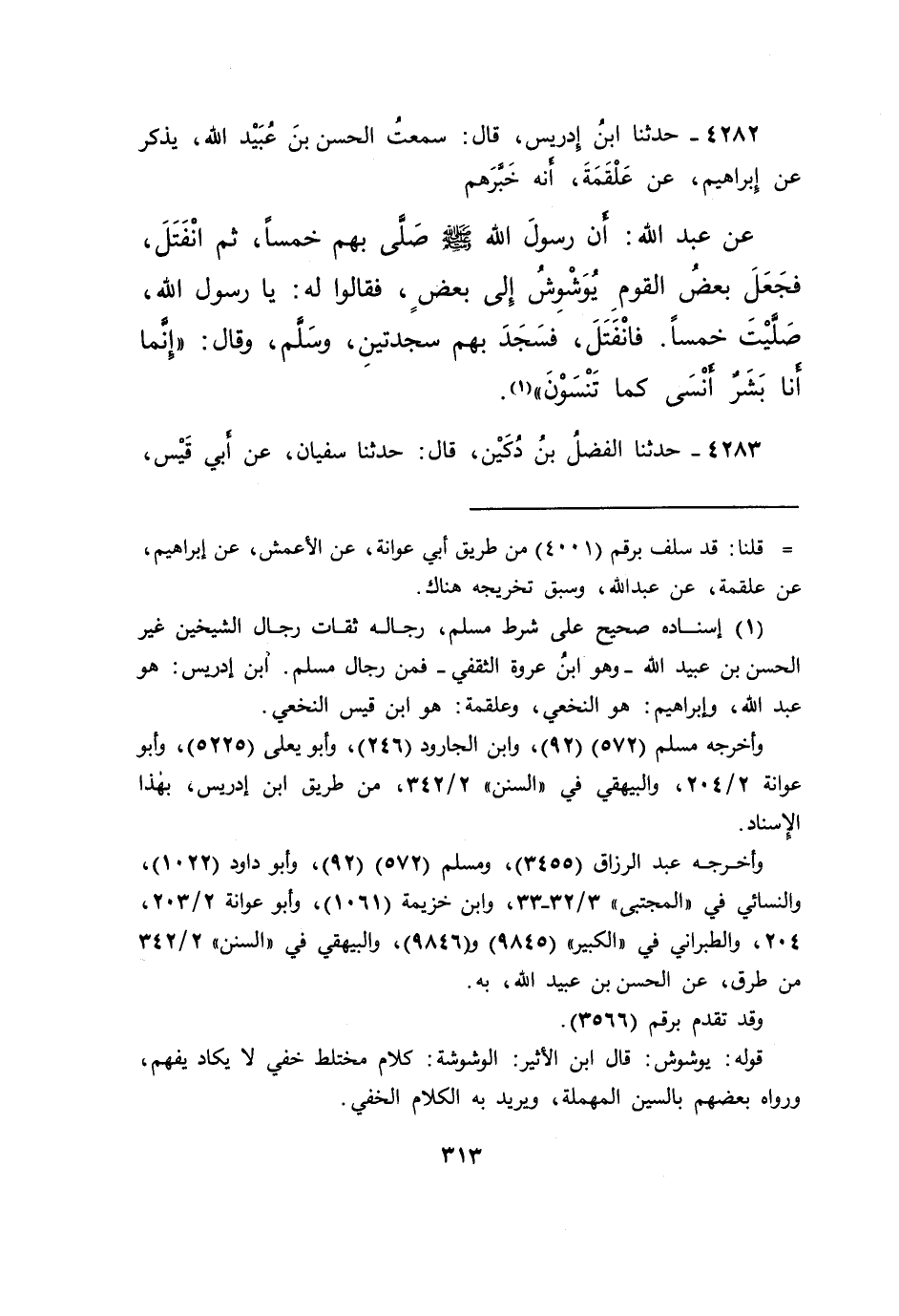 ٤٢٨٢ - حَدَّثَنَا ابْنُ إِدْرِيسَ، قَالَ: سَمِعْتُ الْحَسَنَ بْنَ عُبَيْدِ اللهِ، يَذْكُرُ عَنْ إِبْرَاهِيمَ، عَنْ عَلْقَمَةَ، أَنَّهُ أَخْبَرَهُمْ عَنْ عَبْدِ اللهِ: أَنَّ رَسُولَ اللهِ صَلَّى اللهُ عَلَيْهِ وَسَلَّمَ صَلَّى بِهِمْ خَمْسًا، ثُمَّ انْفَتَلَ، فَجَعَلَ بَعْضُ الْقَوْمِ يُوَشْوِشُ إِلَى بَعْضٍ، فَقَالُوا لَهُ: يَا رَسُولَ اللهِ، صَلَّيْتَ خَمْسًا، فَانْفَتَلَ، فَسَجَدَ بِهِمْ سَجْدَتَيْنِ، وَسَلَّمَ، وَقَالَ: " إِنَّمَا أَنَا بَشَرٌ أَنْسَى كَمَا تَنْسَوْنَ " (١)