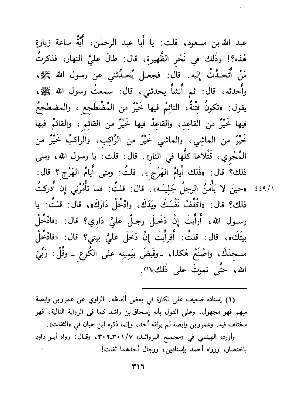 عَبْدُ اللهِ بْنُ مَسْعُودٍ، قُلْتُ: يَا أَبَا عَبْدِ الرَّحْمَنِ، أَيَّةُ سَاعَةِ زِيَارَةٍ هَذِهِ؟ وَذَلِكَ فِي نَحْرِ الظَّهِيرَةِ، قَالَ: طَالَ عَلَيَّ النَّهَارُ، فَذَكَرْتُ مَنْ أَتَحَدَّثُ إِلَيْهِ، قَالَ: فَجَعَلَ يُحَدِّثُنِي عَنْ رَسُولِ اللهِ صَلَّى اللهُ عَلَيْهِ وَسَلَّمَ وَأُحَدِّثُهُ، قَالَ: ثُمَّ أَنْشَأَ يُحَدِّثُنِي، قَالَ: سَمِعْتُ رَسُولَ اللهِ صَلَّى اللهُ عَلَيْهِ وَسَلَّمَ يَقُولُ: " تَكُونُ فِتْنَةٌ، النَّائِمُ فِيهَا خَيْرٌ مِنَ الْمُضْطَجِعِ، وَالْمُضْطَجِعُ فِيهَا خَيْرٌ مِنَ الْقَاعِدِ، وَالْقَاعِدُ فِيهَا خَيْرٌ مِنَ الْقَائِمِ، وَالْقَائِمُ فِيهَا خَيْرٌ مِنَ الْمَاشِي، وَالْمَاشِي خَيْرٌ مِنَ الرَّاكِبِ، وَالرَّاكِبُ خَيْرٌ مِنَ الْمُجْرِي قَتْلَاهَا كُلُّهَا فِي النَّارِ "، قَالَ: قُلْتُ: يَا رَسُولَ اللهِ، وَمَتَى ذَلِكَ؟، قَالَ: " ذَلِكَ أَيَّامَ الْهَرْجِ "، قُلْتُ: وَمَتَى أَيَّامُ الْهَرْجِ؟ قَالَ: " حِينَ لَا يَأْمَنُ الرَّجُلُ جَلِيسَهُ "، قَالَ: قُلْتُ: فَمَا تَأْمُرُنِي إِنْ أَدْرَكْتُ ذَلِكَ؟ قَالَ: " اكْفُفْ نَفْسَكَ وَيَدَكَ، وَادْخُلْ دَارَكَ "، قَالَ: قُلْتُ: يَا رَسُولَ اللهِ، أَرَأَيْتَ إِنْ دَخَلَ رَجُلٌ عَلَيَّ دَارِي؟ قَالَ: " فَادْخُلْ بَيْتَكَ "، قَالَ: قُلْتُ: أَفَرَأَيْتَ إِنْ دَخَلَ عَلَيَّ بَيْتِي؟ قَالَ: " فَادْخُلْ مَسْجِدَكَ، وَاصْنَعْ هَكَذَا، - وَقَبَضَ بِيَمِينِهِ عَلَى الْكُوعِ - وَقُلْ: رَبِّيَ اللهُ، حَتَّى تَمُوتَ عَلَى ذَلِكَ " (١)