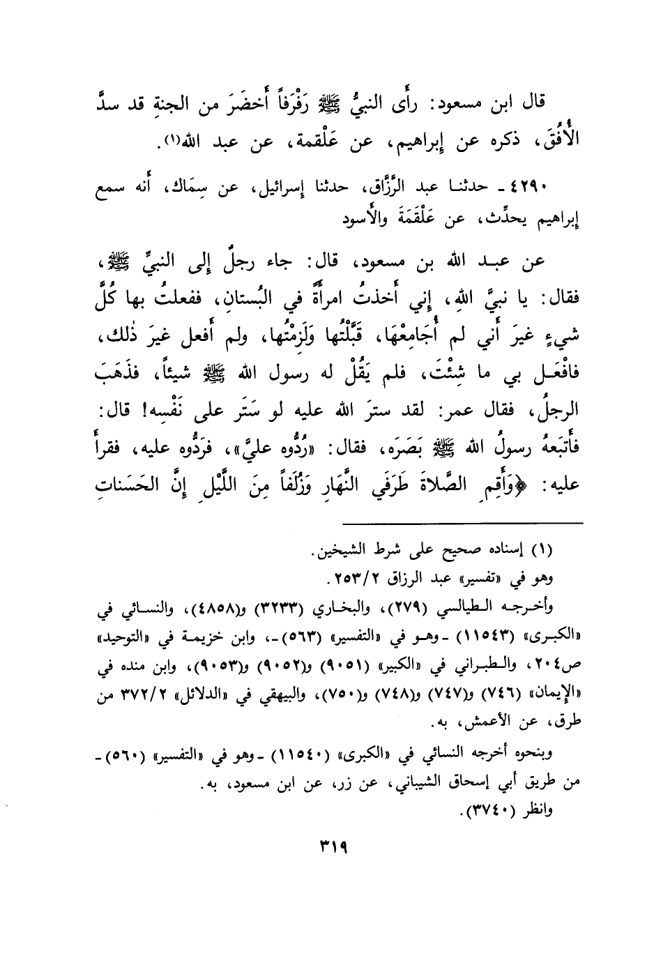 ٤٢٩٠ - حَدَّثَنَا عَبْدُ الرَّزَّاقِ، حَدَّثَنَا إِسْرَائِيلُ، عَنْ سِمَاكٍ، أَنَّهُ: سَمِعَ إِبْرَاهِيمَ، يُحَدِّثُ، عَنْ عَلْقَمَةَ، وَالْأَسْوَدِ، عَنْ عَبْدِ اللهِ بْنِ مَسْعُودٍ، قَالَ: جَاءَ رَجُلٌ إِلَى النَّبِيِّ صَلَّى اللهُ عَلَيْهِ وَسَلَّمَ، فَقَالَ: يَا نَبِيَّ اللهِ، إِنِّي أَخَذْتُ امْرَأَةً فِي الْبُسْتَانِ، فَفَعَلْتُ بِهَا كُلَّ شَيْءٍ غَيْرَ أَنِّي لَمْ أُجَامِعْهَا، قَبَّلْتُهَا وَلَزِمْتُهَا، وَلَمْ أَفْعَلْ غَيْرَ ذَلِكَ، فَافْعَلْ بِي مَا شِئْتَ، فَلَمْ يَقُلْ لَهُ رَسُولُ اللهِ صَلَّى اللهُ عَلَيْهِ وَسَلَّمَ شَيْئًا، فَذَهَبَ الرَّجُلُ، فَقَالَ عُمَرُ: لَقَدْ سَتَرَ اللهُ عَلَيْهِ لَوْ سَتَرَ عَلَى نَفْسِهِ قَالَ فَأَتْبَعَهُ رَسُولُ اللهِ صَلَّى اللهُ عَلَيْهِ وَسَلَّمَ بَصَرَهُ، فَقَالَ: " رُدُّوهُ عَلَيَّ "، فَرَدُّوهُ عَلَيْهِ، فَقَرَأَ عَلَيْهِ {وَأَقِمِ الصَّلَاةَ طَرَفَيِ النَّهَارِ، وَزُلَفًا مِنَ اللَّيْلِ إِنَّ الْحَسَنَاتِ