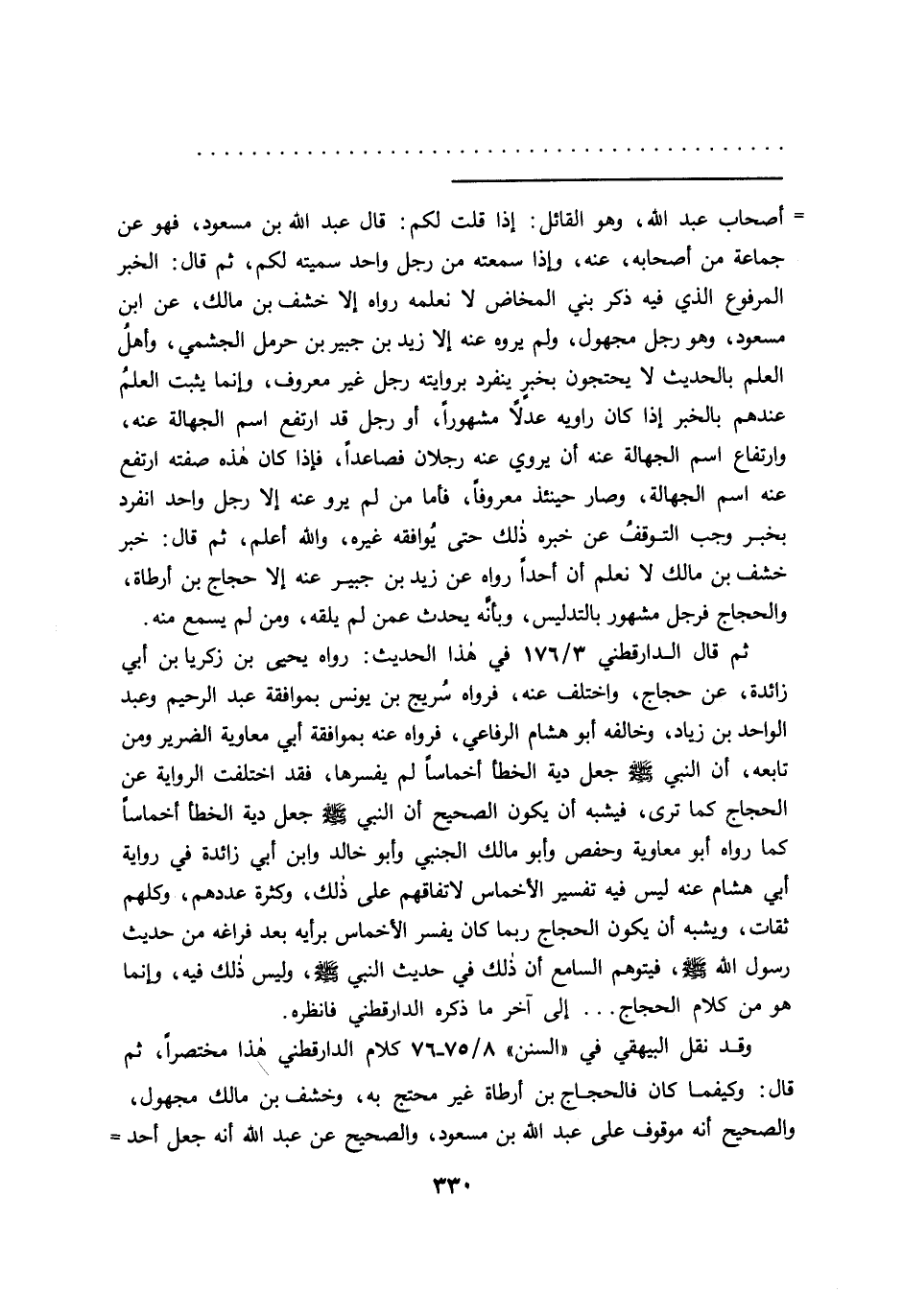 ثم قال الدارقطني ٣/١٧٦ في هذا الحديث: رواه يحيى بن زكريا بن أبي زائدة، عن حجاج، واختلف عنه، فرواه سُريج بن يونس بموافقة عبد الرحيم وعبد الواحد بن زياد، وخالفه أبو هشام الرفاعي، فرواه عنه بموافقة أبي معاوية الضرير ومن تابعه، أن النبي صَلَّى اللهُ عَلَيْهِ وَسَلَّمَ جعل دية الخطأ أخماساً لم يفسرها، فقد اختلفت الرواية عن الحجاج كما ترى، فيشبه أن يكون الصحيح أن النبي صَلَّى اللهُ عَلَيْهِ وَسَلَّمَ جعل دية الخطأ أخماساً كما رواه أبو معاوية وحفص وأبو مالك الجنبي وأبو خالد وابن أبي زائدة في رواية أبي هشام عنه ليس فيه تفسير الأخماس لاتفاقهم على ذلك، وكثرة عددهم، وكلهم ثقات، ويشبه أن يكون الحجاج ربما كان يفسر الأخماس برأيه بعد فراغه من حديث رسول الله صَلَّى اللهُ عَلَيْهِ وَسَلَّمَ، فيتوهم السامع أن ذلك في حديث النبي صَلَّى اللهُ عَلَيْهِ وَسَلَّمَ، وليس ذلك فيه، وإنما هو من كلام الحجاج ... إلى آخر ما ذكره الدارقطني فانظره.