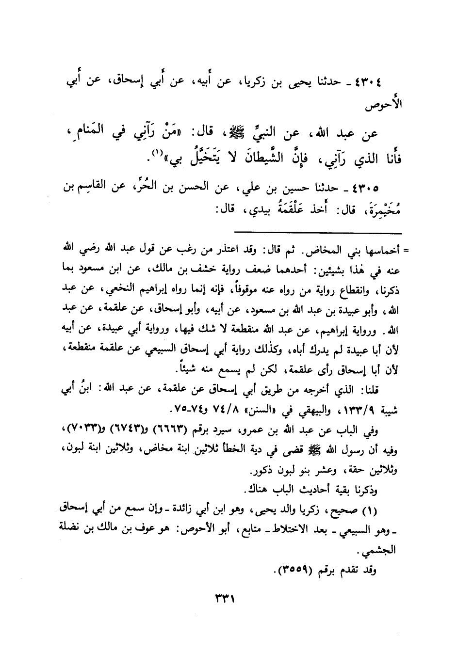 ٤٣٠٤ - حَدَّثَنَا يَحْيَى بْنُ زَكَرِيَّا، عَنْ أَبِيهِ، عَنْ أَبِي إِسْحَاقَ، عَنْ أَبِي الْأَحْوَصِ، عَنْ عَبْدِ اللهِ، عَنِ النَّبِيِّ صَلَّى اللهُ عَلَيْهِ وَسَلَّمَ قَالَ: " مَنْ رَآنِي فِي الْمَنَامِ، فَأَنَا الَّذِي رَآنِي، فَإِنَّ الشَّيْطَانَ لَا يَتَخَيَّلُ بِي " (١)