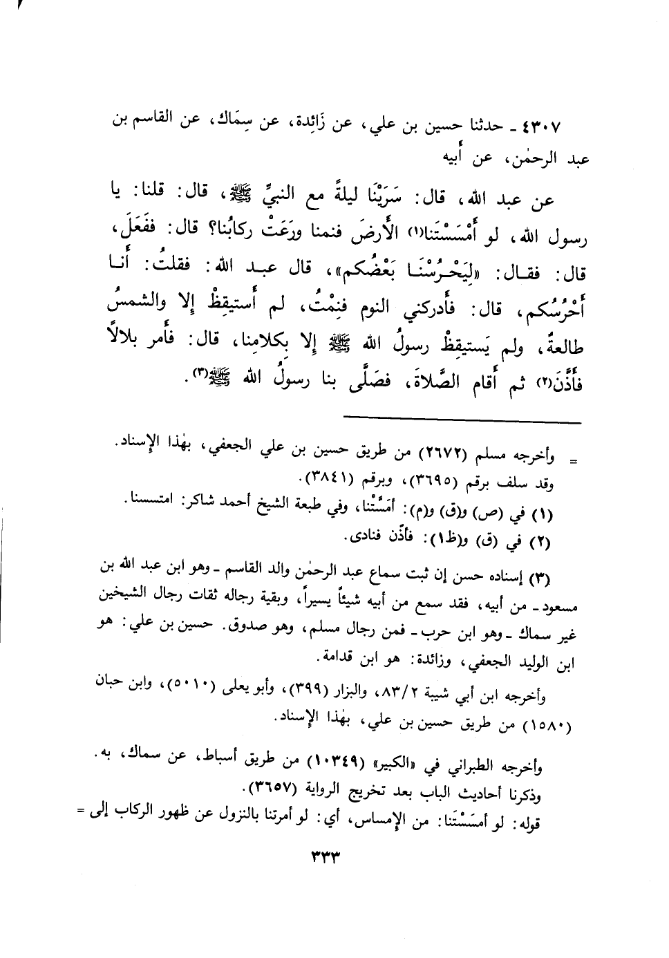 ٤٣٠٧ - حَدَّثَنَا حُسَيْنُ بْنُ عَلِيٍّ، عَنْ زَائِدَةَ، عَنْ سِمَاكٍ، عَنِ الْقَاسِمِ بْنِ عَبْدِ الرَّحْمَنِ، عَنْ أَبِيهِ، عَنْ عَبْدِ اللهِ، قَالَ: سَرَيْنَا لَيْلَةً مَعَ النَّبِيِّ صَلَّى اللهُ عَلَيْهِ وَسَلَّمَ، قَالَ: قُلْنَا: يَا رَسُولَ اللهِ، لَوِ امْتَسَسْنَا (١) الْأَرْضَ فَنِمْنَا وَرَعَتْ رِكَابُنَا؟ قَالَ: " فَفَعَلَ "، قَالَ: فَقَالَ: " لِيَحْرُسْنَا بَعْضُكُمْ "، قَالَ عَبْدُ اللهِ: فَقُلْتُ: أَنَا أَحْرُسُكُمْ، قَالَ: فَأَدْرَكَنِي النَّوْمُ فَنِمْتُ، لَمْ أَسْتَيْقِظْ إِلَّا، وَالشَّمْسُ طَالِعَةٌ، وَلَمْ يَسْتَيْقِظْ رَسُولُ اللهِ صَلَّى اللهُ عَلَيْهِ وَسَلَّمَ إِلَّا بِكَلَامِنَا، " فَأَمَرَ بِلَالًا فَأَذَّنَ (٢) ثُمَّ أَقَامَ الصَّلَاةَ، فَصَلَّى بِنَا رَسُولُ اللهِ صَلَّى اللهُ عَلَيْهِ وَسَلَّمَ " (٣)