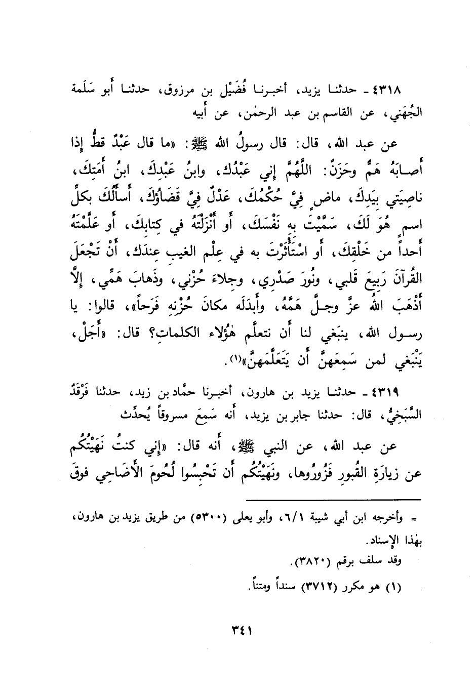 ٤٣١٨ - حَدَّثَنَا يَزِيدُ، أَخْبَرَنَا فُضَيْلُ بْنُ مَرْزُوقٍ، حَدَّثَنَا أَبُو سَلَمَةَ الْجُهَنِيُّ، عَنْ الْقَاسِمِ بْنِ عَبْدِ الرَّحْمَنِ، عَنْ أَبِيهِ، عَنْ عَبْدِ اللهِ، قَالَ: قَالَ رَسُولُ اللهِ صَلَّى اللهُ عَلَيْهِ وَسَلَّمَ: " مَا قَالَ عَبْدٌ قَطُّ إِذَا أَصَابَهُ هَمٌّ وَحَزَنٌ: اللهُمَّ إِنِّي عَبْدُكَ، وَابْنُ عَبْدِكَ، ابْنُ أَمَتِكَ، نَاصِيَتِي بِيَدِكَ، مَاضٍ فِيَّ حُكْمُكَ، عَدْلٌ فِيَّ قَضَاؤُكَ، أَسْأَلُكَ بِكُلِّ اسْمٍ هُوَ لَكَ، سَمَّيْتَ بِهِ نَفْسَكَ، أَوْ أَنْزَلْتَهُ فِي كِتَابِكَ، أَوْ عَلَّمْتَهُ أَحَدًا مِنْ خَلْقِكَ، أَوِ اسْتَأْثَرْتَ بِهِ فِي عِلْمِ الْغَيْبِ عِنْدَكَ، أَنْ تَجْعَلَ الْقُرْآنَ رَبِيعَ قَلْبِي، وَنُورَ صَدْرِي، وَجِلَاءَ حُزْنِي، وَذَهَابَ هَمِّي، إِلَّا أَذْهَبَ اللهُ عَزَّ وَجَلَّ هَمَّهُ، وَأَبْدَلَهُ مَكَانَ حُزْنِهِ فَرَحًا "، قَالُوا: يَا رَسُولَ اللهِ يَنْبَغِي لَنَا أَنْ نَتَعَلَّمَ هَؤُلَاءِ الْكَلِمَاتِ؟ قَالَ: " أَجَلْ، يَنْبَغِي لِمَنْ سَمِعَهُنَّ أَنْ يَتَعَلَّمَهُنَّ " (١)