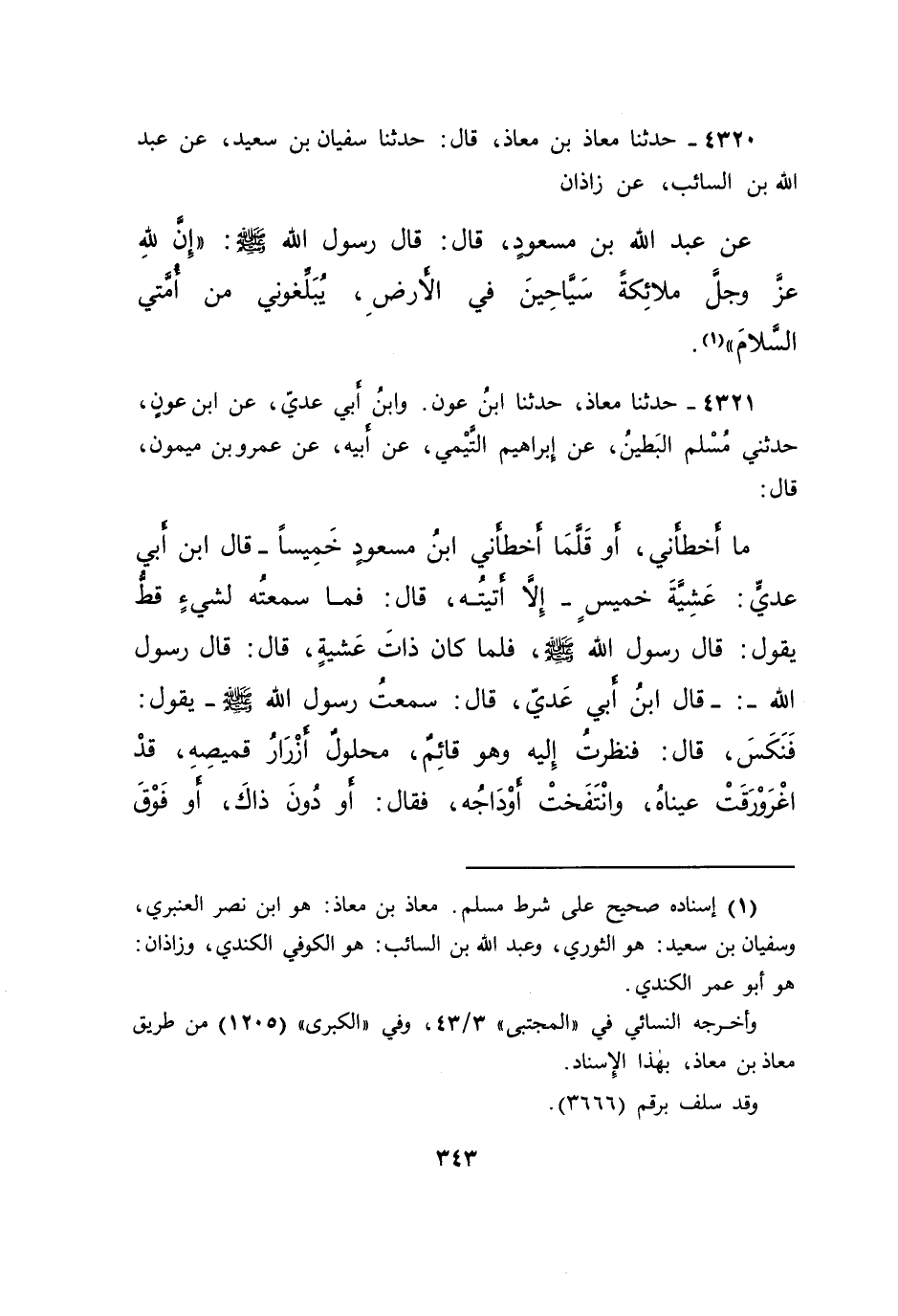 ٤٣٢٠ - حَدَّثَنَا مُعَاذُ بْنُ مُعَاذٍ، قَالَ: حَدَّثَنَا سُفْيَانُ بْنُ سَعِيدٍ، عَنْ عَبْدِ اللهِ بْنِ السَّائِبِ، عَنْ زَاذَانَ، عَنْ عَبْدِ اللهِ بْنِ مَسْعُودٍ، قَالَ: قَالَ رَسُولُ اللهِ صَلَّى اللهُ عَلَيْهِ وَسَلَّمَ: " إِنَّ لِلَّهِ عَزَّ وَجَلَّ مَلَائِكَةً سَيَّاحِينَ فِي الْأَرْضِ، يُبَلِّغُونِي مِنْ أُمَّتِي السَّلَامَ " (١)