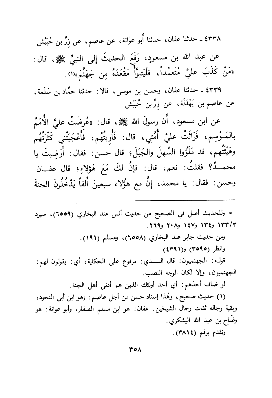 ٤٣٣٨ - حَدَّثَنَا عَفَّانُ، حَدَّثَنَا أَبُو عَوَانَةَ، عَنْ عَاصِمٍ، عَنْ زِرِّ بْنِ حُبَيْشٍ، عَنْ عَبْدِ اللهِ بْنِ مَسْعُودٍ، رَفَعَ الْحَدِيثَ إِلَى النَّبِيِّ صَلَّى اللهُ عَلَيْهِ وَسَلَّمَ قَالَ: " مَنْ كَذَبَ عَلَيَّ مُتَعَمِّدًا فَلْيَتَبَوَّأْ مَقْعَدَهُ مِنْ جَهَنَّمَ " (١)