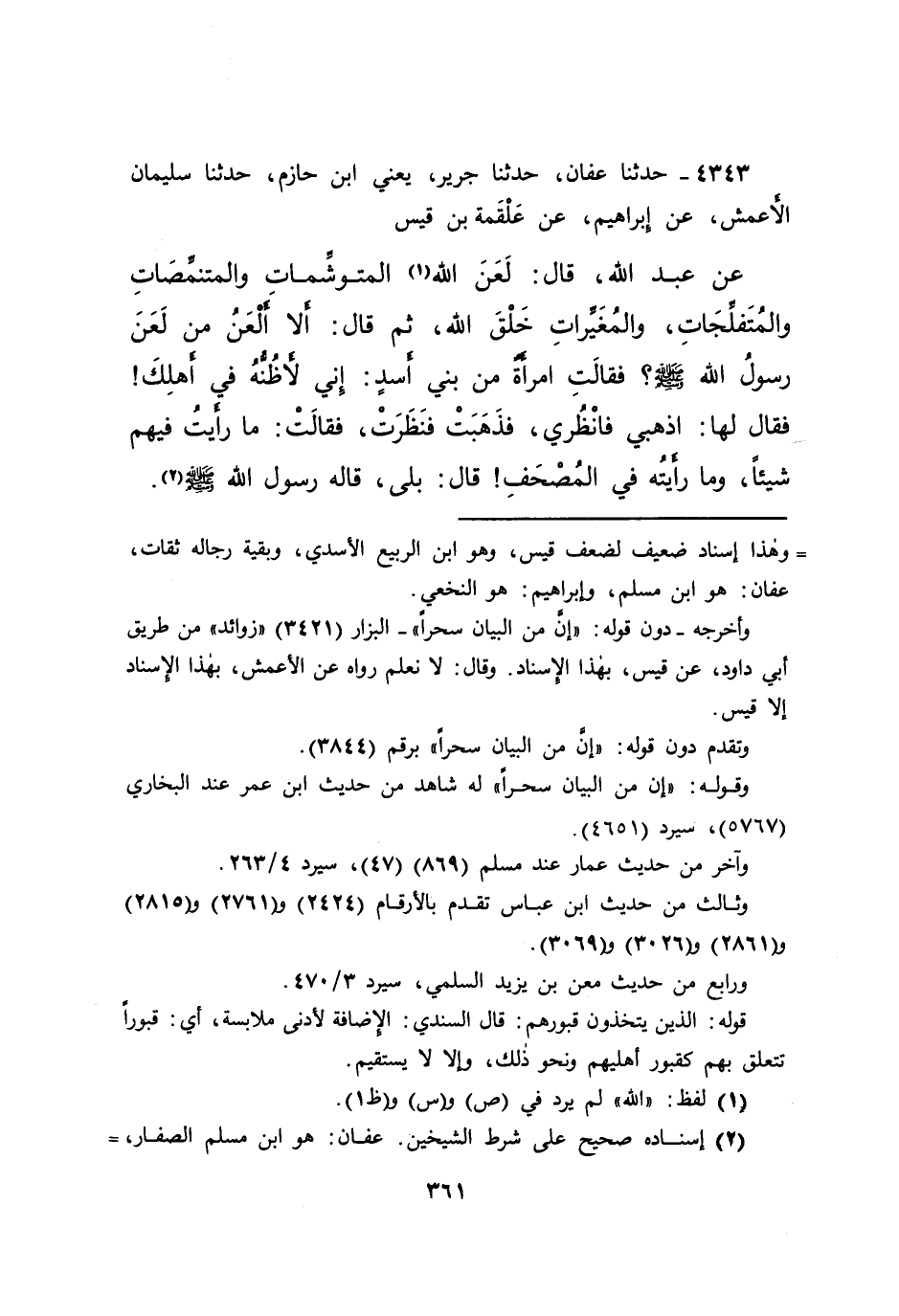٤٣٤٣ - حَدَّثَنَا عَفَّانُ، حَدَّثَنَا جَرِيرٌ يَعْنِي ابْنَ حَازِمٍ، حَدَّثَنَا الْأَعْمَشُ، عَنْ إِبْرَاهِيمَ، عَنْ عَلْقَمَةَ بْنِ قَيْسٍ، عَنْ عَبْدِ اللهِ، قَالَ: " لَعَنَ اللهُ (١) الْمُتَوَشِّمَاتِ، وَالْمُتَنَمِّصَاتِ، وَالْمُتَفَلِّجَاتِ، وَالْمُغَيِّرَاتِ خَلْقَ اللهِ "، ثُمَّ قَالَ: " أَلَا أَلْعَنُ مَنْ لَعَنَ رَسُولُ اللهِ صَلَّى اللهُ عَلَيْهِ وَسَلَّمَ؟ "، فَقَالَتِ امْرَأَةٌ مِنْ بَنِي أَسَدٍ: إِنِّي لَأَظُنُّهُ فِي أَهْلِكَ. فَقَالَ لَهَا: اذْهَبِي فَانْظُرِي فَذَهَبَتْ فَنَظَرَتْ. فَقَالَتْ: مَا رَأَيْتُ فِيهِمْ شَيْئًا، وَمَا رَأَيْتُهُ فِي الْمُصْحَفِ قَالَ: بَلَى قَالَهُ رَسُولُ اللهِ صَلَّى اللهُ عَلَيْهِ وَسَلَّمَ (٢)