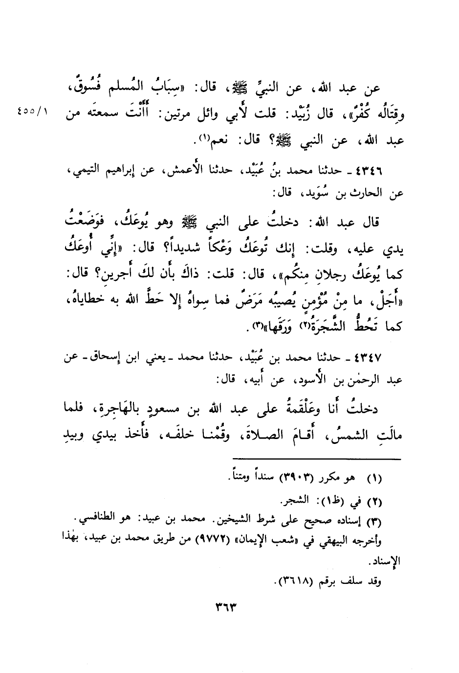 عَنْ عَبْدِ اللهِ، عَنِ النَّبِيِّ صَلَّى اللهُ عَلَيْهِ وَسَلَّمَ قَالَ: " سِبَابُ الْمُسْلِمِ فُسُوقٌ، وَقِتَالُهُ كُفْرٌ " قَالَ زُبَيْدٌ: قُلْتُ لِأَبِي وَائِلٍ مَرَّتَيْنِ: أَأَنْتَ سَمِعْتَهُ مِنْ عَبْدِ اللهِ، عَنِ النَّبِيِّ صَلَّى اللهُ عَلَيْهِ وَسَلَّمَ قَالَ: نَعَمْ (١)