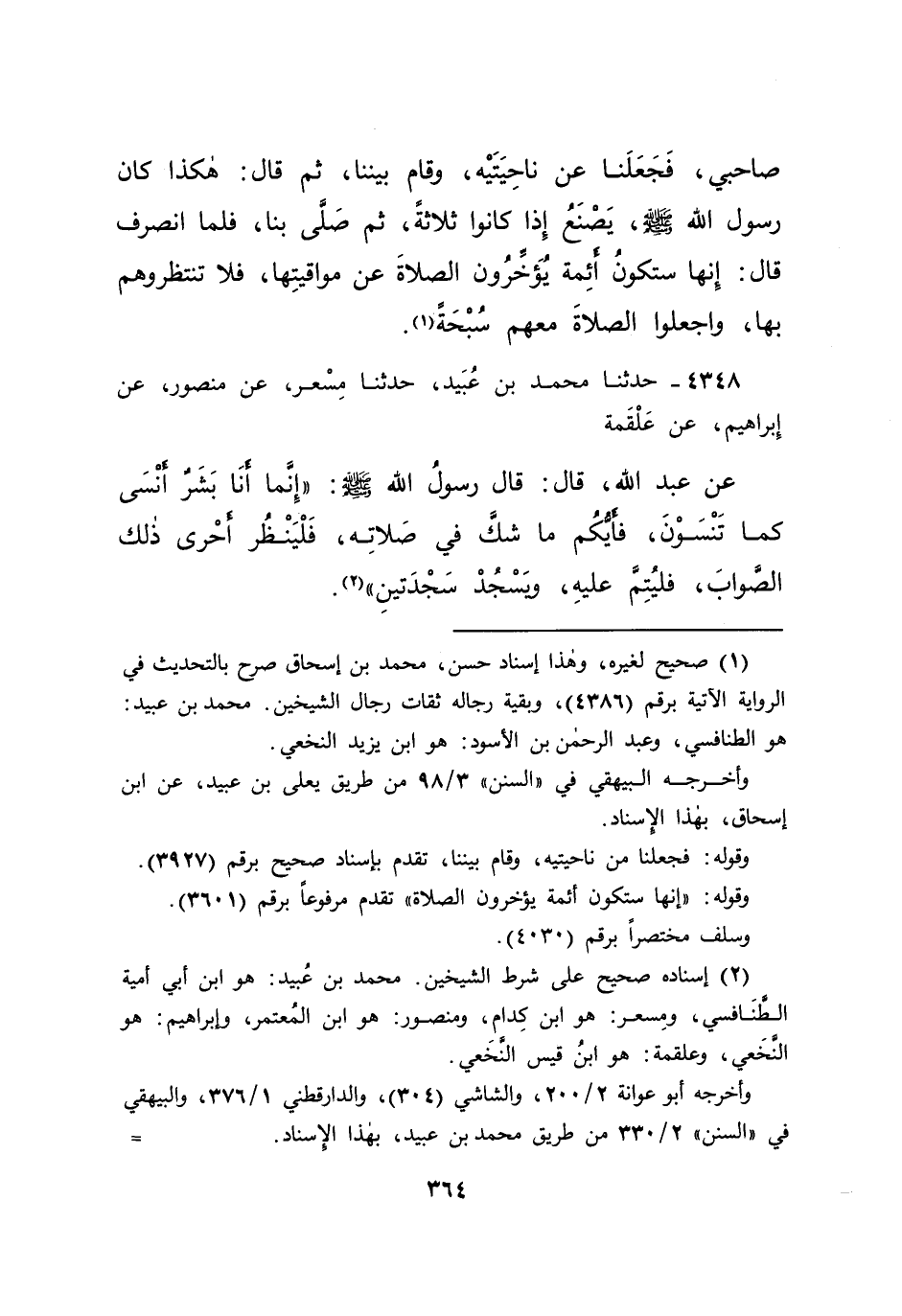٤٣٤٨ - حَدَّثَنَا مُحَمَّدُ بْنُ عُبَيْدٍ، حَدَّثَنَا مِسْعَرٌ، عَنْ مَنْصُورٍ، عَنْ إِبْرَاهِيمَ، عَنْ عَلْقَمَةَ، عَنْ عَبْدِ اللهِ، قَالَ: قَالَ رَسُولُ اللهِ صَلَّى اللهُ عَلَيْهِ وَسَلَّمَ: " إِنَّمَا أَنَا بَشَرٌ أَنْسَى كَمَا تَنْسَوْنَ فَأَيُّكُمْ مَا شَكَّ فِي صَلَاتِهِ فَلْيَنْظُرْ أَحْرَى ذَلِكَ الصَّوَابَ فَلْيُتِمَّ عَلَيْهِ، وَيَسْجُدْ سَجْدَتَيْنِ " (٢)