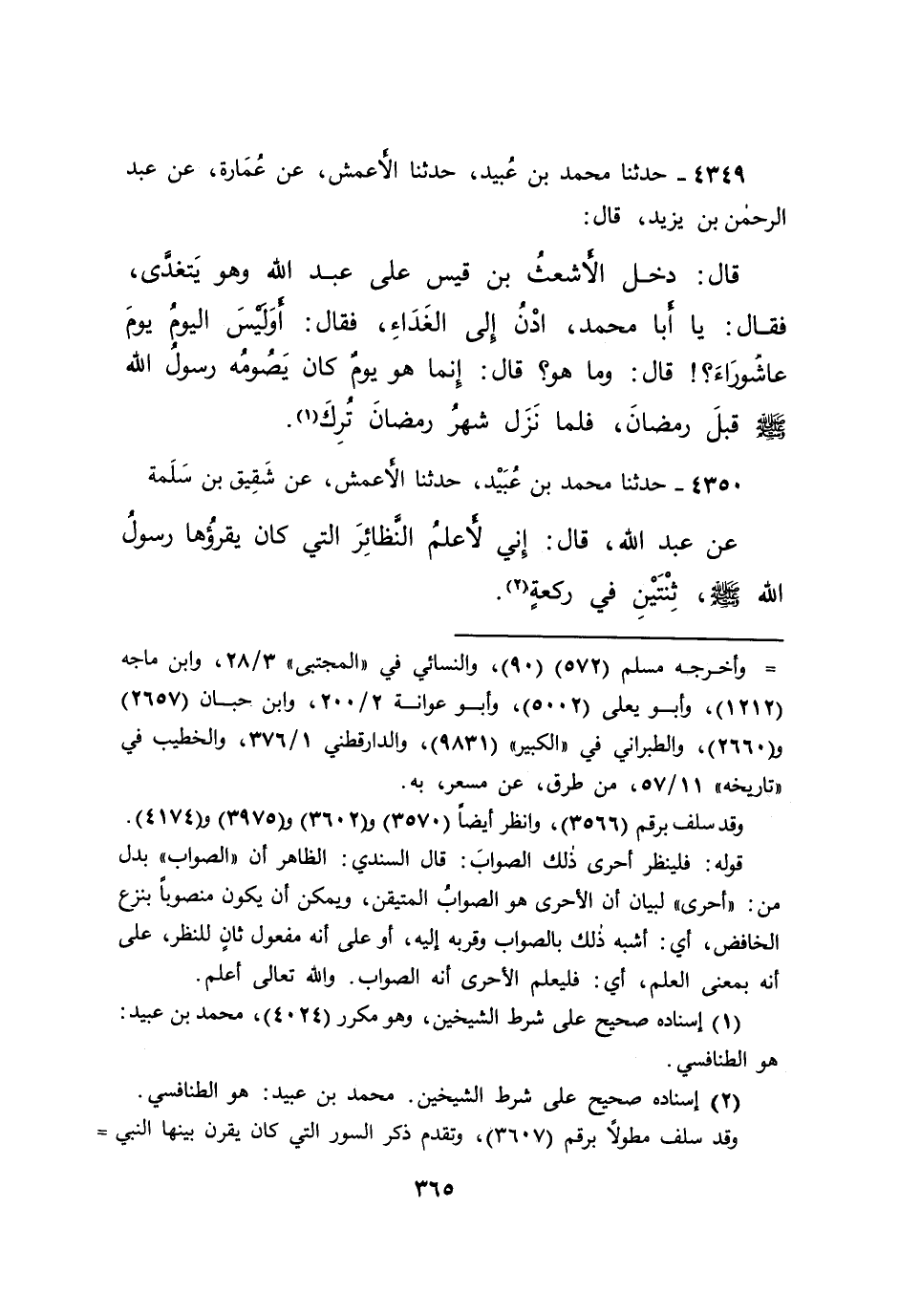 ٤٣٤٩ - حَدَّثَنَا مُحَمَّدُ بْنُ عُبَيْدٍ، حَدَّثَنَا الْأَعْمَشُ، عَنْ عُمَارَةَ، عَنْ عَبْدِ الرَّحْمَنِ بْنِ يَزِيدَ، قَالَ: دَخَلَ الْأَشْعَثُ بْنُ قَيْسٍ عَلَى عَبْدِ اللهِ وَهُوَ يَتَغَدَّى، فَقَالَ: يَا أَبَا مُحَمَّدٍ ادْنُ إِلَى الْغَدَاءِ، فَقَالَ: أَوَ لَيْسَ الْيَوْمَ يَوْمُ عَاشُورَاءَ؟، قَالَ: وَمَا هُوَ؟ قَالَ: " إِنَّمَا هُوَ يَوْمٌ كَانَ يَصُومُهُ رَسُولُ اللهِ صَلَّى اللهُ عَلَيْهِ وَسَلَّمَ قَبْلَ رَمَضَانَ، فَلَمَّا نَزَلَ شَهْرُ رَمَضَانَ تُرِكَ " (١)
