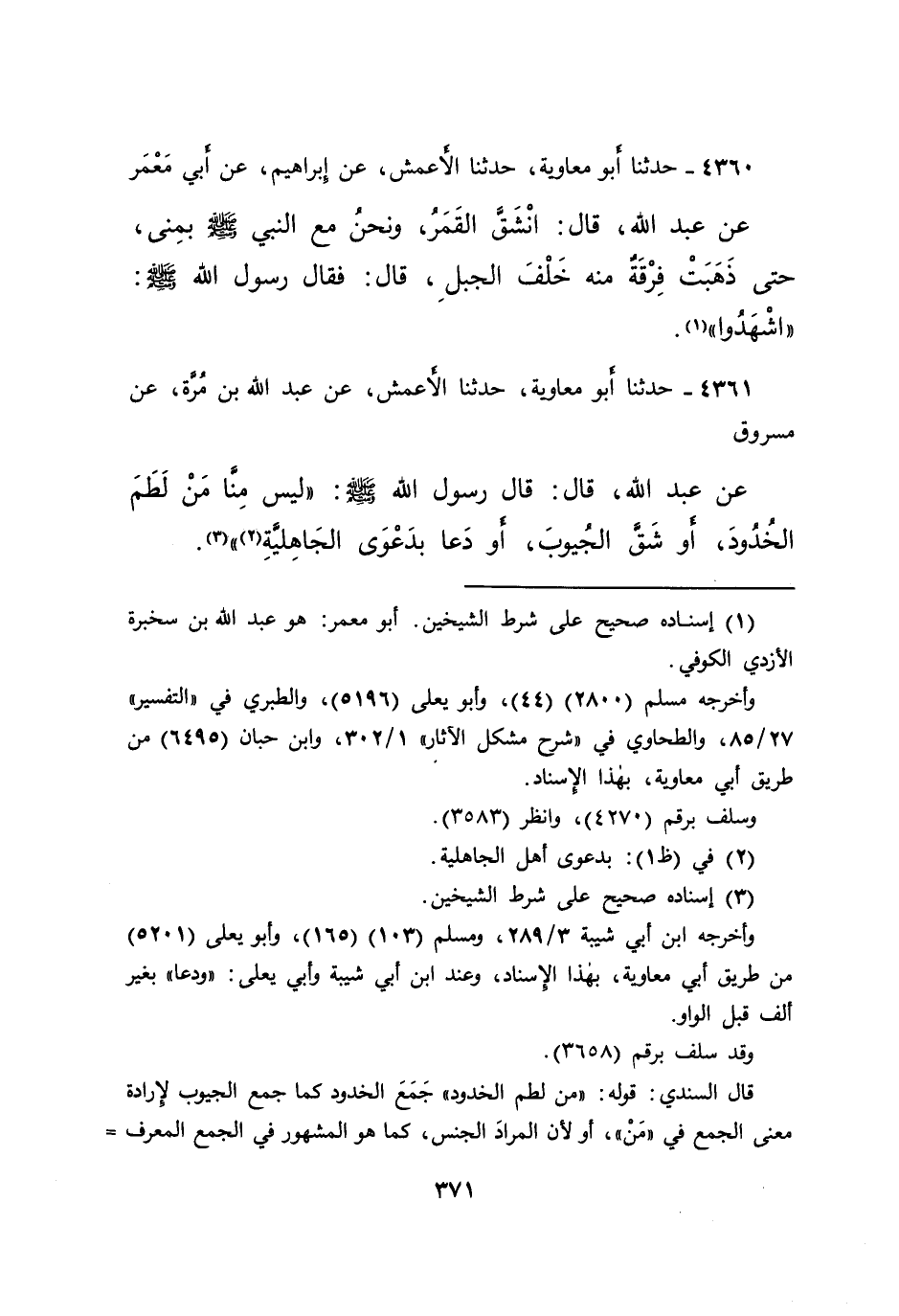 ٤٣٦٠ - حَدَّثَنَا أَبُو مُعَاوِيَةَ، حَدَّثَنَا الْأَعْمَشُ، عَنْ إِبْرَاهِيمَ، عَنْ أَبِي مَعْمَرٍ، عَنْ عَبْدِ اللهِ، قَالَ: انْشَقَّ الْقَمَرُ، وَنَحْنُ مَعَ النَّبِيِّ صَلَّى اللهُ عَلَيْهِ وَسَلَّمَ بِمِنًى حَتَّى ذَهَبَتْ فِرْقَةٌ مِنْهُ، خَلْفَ الْجَبَلِ قَالَ: فَقَالَ رَسُولُ اللهِ صَلَّى اللهُ عَلَيْهِ وَسَلَّمَ: " اشْهَدُوا " (١)