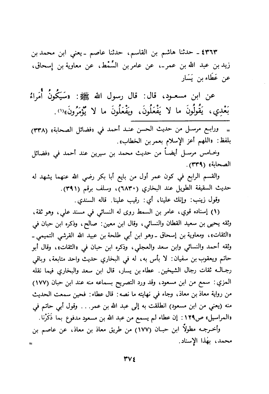٤٣٦٣ - حَدَّثَنَا هَاشِمُ بْنُ الْقَاسِمِ، حَدَّثَنَا عَاصِمٌ يَعْنِي ابْنَ مُحَمَّدِ بْنِ زَيْدِ بْنِ عَبْدِ اللهِ بْنِ عُمَرَ، عَنْ عَامِرِ بْنِ السِّمْطِ، عَنْ مُعَاوِيَةَ بْنِ إِسْحَاقَ، عَنْ عَطَاءِ بْنِ يَسَارٍ، عَنِ ابْنِ مَسْعُودٍ، قَالَ: قَالَ رَسُولُ اللهِ صَلَّى اللهُ عَلَيْهِ وَسَلَّمَ: " سَيَكُونُ أُمَرَاءُ بَعْدِي يَقُولُونَ، مَا لَا يَفْعَلُونَ، وَيَفْعَلُونَ مَا لَا يُؤْمَرُونَ " (١)