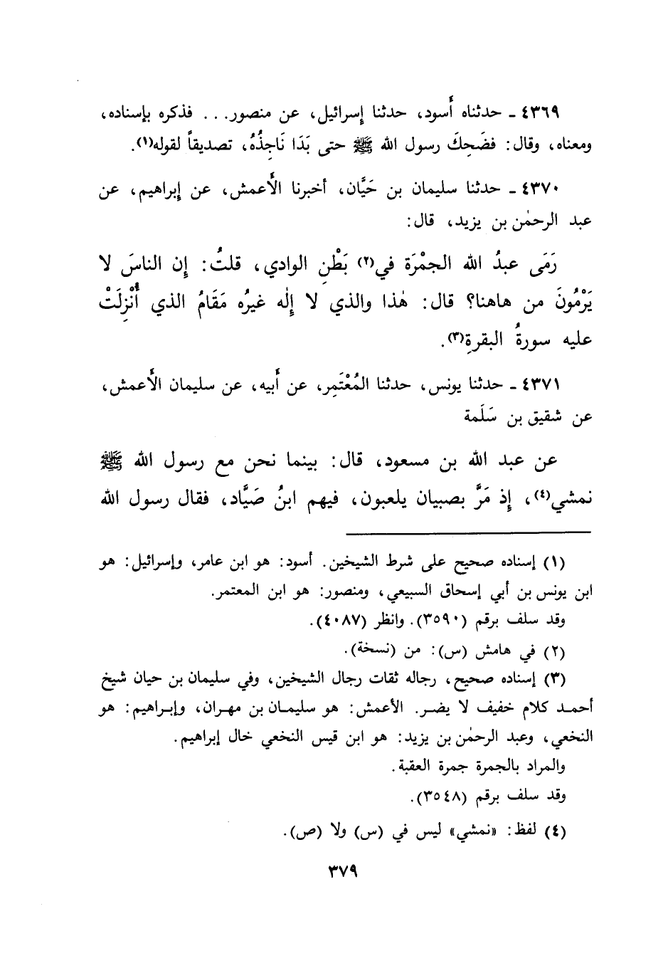 ٤٣٧٠ - حَدَّثَنَا سُلَيْمَانُ بْنُ حَيَّانَ، أَخْبَرَنَا الْأَعْمَشُ، عَنْ إِبْرَاهِيمَ، عَنْ عَبْدِ الرَّحْمَنِ بْنِ يَزِيدَ، قَالَ: " رَمَى عَبْدُ اللهِ الْجَمْرَةَ (٢) فِي بَطْنِ الْوَادِي ". قُلْتُ: إِنَّ النَّاسَ لَا يَرْمُونَ مِنْ هَاهُنَا، قَالَ: " هَذَا وَالَّذِي لَا إِلَهَ غَيْرُهُ مَقَامُ الَّذِي أُنْزِلَتْ عَلَيْهِ سُورَةُ الْبَقَرَةِ " (٣)
