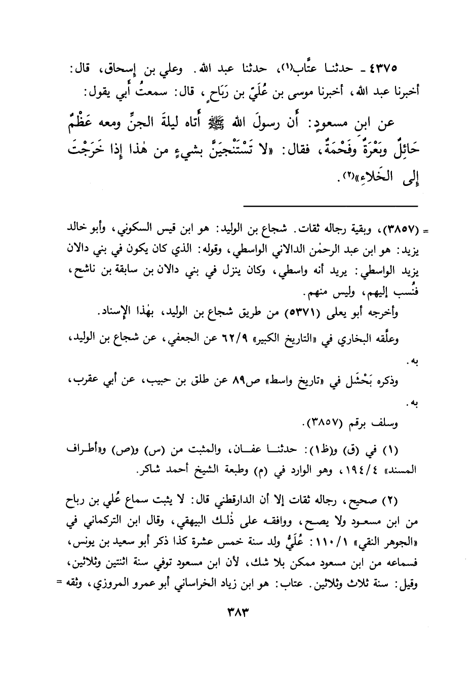 ٤٣٧٥ - حَدَّثَنَا عَتَّابٌ (١) ، حَدَّثَنَا عَبْدُ اللهِ، وَعَلِيُّ بْنُ إِسْحَاقَ، قَالَ: أَخْبَرَنَا عَبْدُ اللهِ، أَخْبَرَنَا مُوسَى بْنُ عَلِيِّ بْنِ رَبَاحٍ، قَالَ: سَمِعْتُ أَبِي يَقُولُ: عَنْ ابْنِ مَسْعُودٍ: أَنَّ رَسُولَ اللهِ صَلَّى اللهُ عَلَيْهِ وَسَلَّمَ، أَتَاهُ لَيْلَةَ الْجِنِّ وَمَعَهُ عَظْمٌ حَائِلٌ، وَبَعْرَةٌ، وَفَحْمَةٌ، فَقَالَ: " لَا تَسْتَنْجِيَنَّ بِشَيْءٍ مِنْ هَذَا إِذَا خَرَجْتَ إِلَى الْخَلَاءِ " (٢)