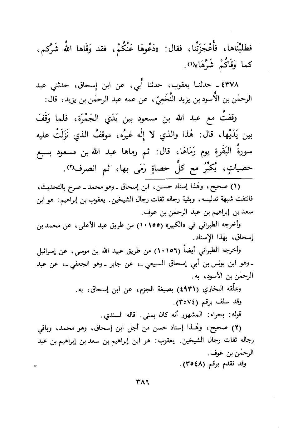 ٤٣٧٨ - حَدَّثَنَا يَعْقُوبُ، حَدَّثَنَا أَبِي، عَنْ ابْنِ إِسْحَاقَ، حَدَّثَنِي عَبْدُ الرَّحْمَنِ بْنُ الْأَسْوَدِ بْنِ يَزِيدَ النَّخَعِيُّ، عَنْ عَمِّهِ عَبْدِ الرَّحْمَنِ بْنِ يَزِيدَ، قَالَ: وَقَفْتُ مَعَ عَبْدِ اللهِ بْنِ مَسْعُودٍ بَيْنَ يَدَيِ الْجَمْرَةِ فَلَمَّا وَقَفَ بَيْنَ يَدَيْهَا قَالَ: " هَذَا وَالَّذِي لَا إِلَهَ غَيْرُهُ، مَوْقِفُ الَّذِي أُنْزِلَتْ عَلَيْهِ سُورَةُ الْبَقَرَةِ يَوْمَ رَمَاهَا "، قَالَ: ثُمَّ رَمَاهَا عَبْدُ اللهِ بْنُ مَسْعُودٍ بِسَبْعِ حَصَيَاتٍ، يُكَبِّرُ مَعَ كُلِّ حَصَاةٍ رَمَى بِهَا، ثُمَّ انْصَرَفَ (٢)