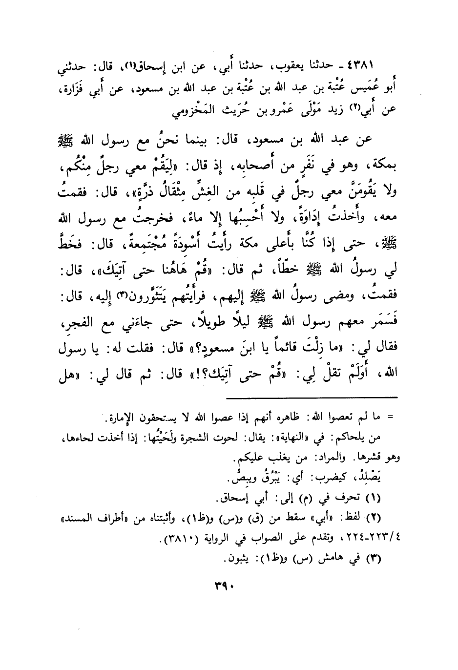 ٤٣٨١ - حَدَّثَنَا يَعْقُوبُ، حَدَّثَنَا أَبِي، عَنْ ابْنِ إِسْحَاقَ (١) ، قَالَ: حَدَّثَنِي أَبُو عُمَيْسٍ عُتْبَةُ بْنُ عَبْدِ اللهِ بْنِ عُتْبَةَ بْنِ عَبْدِ اللهِ بْنِ مَسْعُودٍ، عَنْ أَبِي فَزَارَةَ، عَنْ أَبِي (٢) زَيْدٍ، مَوْلَى عَمْرِو بْنِ حُرَيْثٍ الْمَخْزُومِيِّ، عَنْ عَبْدِ اللهِ بْنِ مَسْعُودٍ، قَالَ: بَيْنَمَا نَحْنُ مَعَ رَسُولِ اللهِ صَلَّى اللهُ عَلَيْهِ وَسَلَّمَ بِمَكَّةَ، وَهُوَ فِي نَفَرٍ مِنْ أَصْحَابِهِ، إِذْ قَالَ: " لِيَقُمْ مَعِي رَجُلٌ مِنْكُمْ، وَلَا يَقُومَنَّ مَعِي رَجُلٌ فِي قَلْبِهِ مِنَ الْغِشِّ مِثْقَالُ ذَرَّةٍ "، قَالَ: فَقُمْتُ مَعَهُ، وَأَخَذْتُ إِدَاوَةً، وَلَا أَحْسَبُهَا إِلَّا مَاءً، فَخَرَجْتُ مَعَ رَسُولِ اللهِ صَلَّى اللهُ عَلَيْهِ وَسَلَّمَ، حَتَّى إِذَا كُنَّا بِأَعْلَى مَكَّةَ رَأَيْتُ أَسْوِدَةً مُجْتَمِعَةً، قَالَ: فَخَطَّ لِي رَسُولُ اللهِ صَلَّى اللهُ عَلَيْهِ وَسَلَّمَ خَطًّا، ثُمَّ قَالَ: " قُمْ هَاهُنَا حَتَّى آتِيَكَ "، قَالَ: فَقُمْتُ، وَمَضَى رَسُولُ اللهِ صَلَّى اللهُ عَلَيْهِ وَسَلَّمَ إِلَيْهِمْ، فَرَأَيْتُهُمْ يَتَثَوَّرُونَ (٣) إِلَيْهِ، قَالَ: فَسَمَرَ مَعَهُمْ رَسُولُ اللهِ صَلَّى اللهُ عَلَيْهِ وَسَلَّمَ لَيْلًا طَوِيلًا، حَتَّى جَاءَنِي مَعَ الْفَجْرِ، فَقَالَ لِي: " مَا زِلْتَ قَائِمًا يَا ابْنَ مَسْعُودٍ؟ "، قَالَ: فَقُلْتُ: يَا رَسُولَ اللهِ، أَوَلَمْ تَقُلْ لِي: " قُمْ حَتَّى آتِيَكَ؟ " قَالَ: ثُمَّ قَالَ لِي: " هَلْ