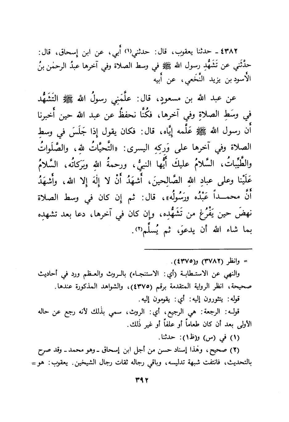 ٤٣٨٢ - حَدَّثَنَا يَعْقُوبُ، قَالَ: حَدَّثَنِي (١) أَبِي، عَنِ ابْنِ إِسْحَاقَ، قَالَ: حَدَّثَنِي عَنْ تَشَهُّدِ رَسُولِ اللهِ صَلَّى اللهُ عَلَيْهِ وَسَلَّمَ فِي وَسَطِ الصَّلَاةِ وَفِي آخِرِهَا، عَبْدُ الرَّحْمَنِ بْنُ الْأَسْوَدِ بْنِ يَزِيدَ النَّخَعِيُّ، عَنْ أَبِيهِ عَنْ عَبْدِ اللهِ بْنِ مَسْعُودٍ، قَالَ: عَلَّمَنِي رَسُولُ اللهِ صَلَّى اللهُ عَلَيْهِ وَسَلَّمَ التَّشَهُّدَ فِي وَسَطِ الصَّلَاةِ وَفِي آخِرِهَا، فَكُنَّا نَحْفَظُ عَنْ عَبْدِ اللهِ حِينَ أَخْبَرَنَا أَنَّ رَسُولَ اللهِ صَلَّى اللهُ عَلَيْهِ وَسَلَّمَ عَلَّمَهُ إِيَّاهُ، قَالَ: فَكَانَ يَقُولُ: إِذَا جَلَسَ فِي وَسَطِ الصَّلَاةِ، وَفِي آخِرِهَا عَلَى وَرِكِهِ الْيُسْرَى: " التَّحِيَّاتُ لِلَّهِ، وَالصَّلَوَاتُ وَالطَّيِّبَاتُ، السَّلَامُ عَلَيْكَ أَيُّهَا النَّبِيُّ، وَرَحْمَةُ اللهِ وَبَرَكَاتُهُ، السَّلَامُ عَلَيْنَا وَعَلَى عِبَادِ اللهِ الصَّالِحِينَ، أَشْهَدُ أَنْ لَا إِلَهَ إِلَّا اللهُ، وَأَشْهَدُ أَنَّ مُحَمَّدًا عَبْدُهُ وَرَسُولُهُ "، قَالَ: " ثُمَّ إِنْ كَانَ فِي وَسَطِ الصَّلَاةِ نَهَضَ حِينَ يَفْرُغُ مِنْ تَشَهُّدِهِ، وَإِنْ كَانَ فِي آخِرِهَا دَعَا بَعْدَ تَشَهُّدِهِ مَا شَاءَ اللهُ أَنْ يَدْعُوَ ثُمَّ يُسَلِّمَ " (٢)