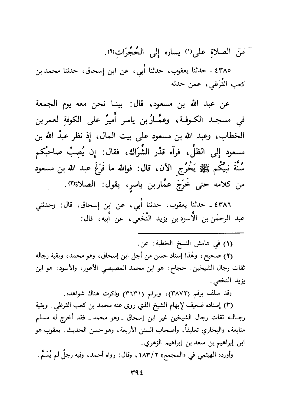 ٤٣٨٥ - حَدَّثَنَا يَعْقُوبُ، حَدَّثَنَا أَبِي، عَنِ ابْنِ إِسْحَاقَ، حَدَّثَنَا مُحَمَّدُ بْنُ كَعْبٍ الْقُرَظِيُّ، عَمَّنْ حَدَّثَهُ عَنْ عَبْدِ اللهِ بْنِ مَسْعُودٍ، قَالَ: بَيْنَا نَحْنُ مَعَهُ يَوْمَ الْجُمُعَةِ فِي مَسْجِدِ الْكُوفَةِ، وَعَمَّارُ بْنُ يَاسِرٍ أَمِيرٌ عَلَى الْكُوفَةِ لِعُمَرَ بْنِ الْخَطَّابِ، وَعَبْدُ اللهِ بْنُ مَسْعُودٍ عَلَى بَيْتِ الْمَالِ إِذْ نَظَرَ عَبْدُ اللهِ بْنُ مَسْعُودٍ إِلَى الظِّلِّ فَرَآهُ قَدْرَ الشِّرَاكِ فَقَالَ: " إِنْ يُصِبْ صَاحِبُكُمْ سُنَّةَ نَبِيِّكُمْ صَلَّى اللهُ عَلَيْهِ وَسَلَّمَ يَخْرُجِ الْآنَ "، قَالَ: فَوَ اللهِ مَا فَرَغَ عَبْدُ اللهِ بْنُ مَسْعُودٍ مِنْ كَلَامِهِ حَتَّى خَرَجَ عَمَّارُ بْنُ يَاسِرٍ يَقُولُ الصَّلَاةَ (٣)